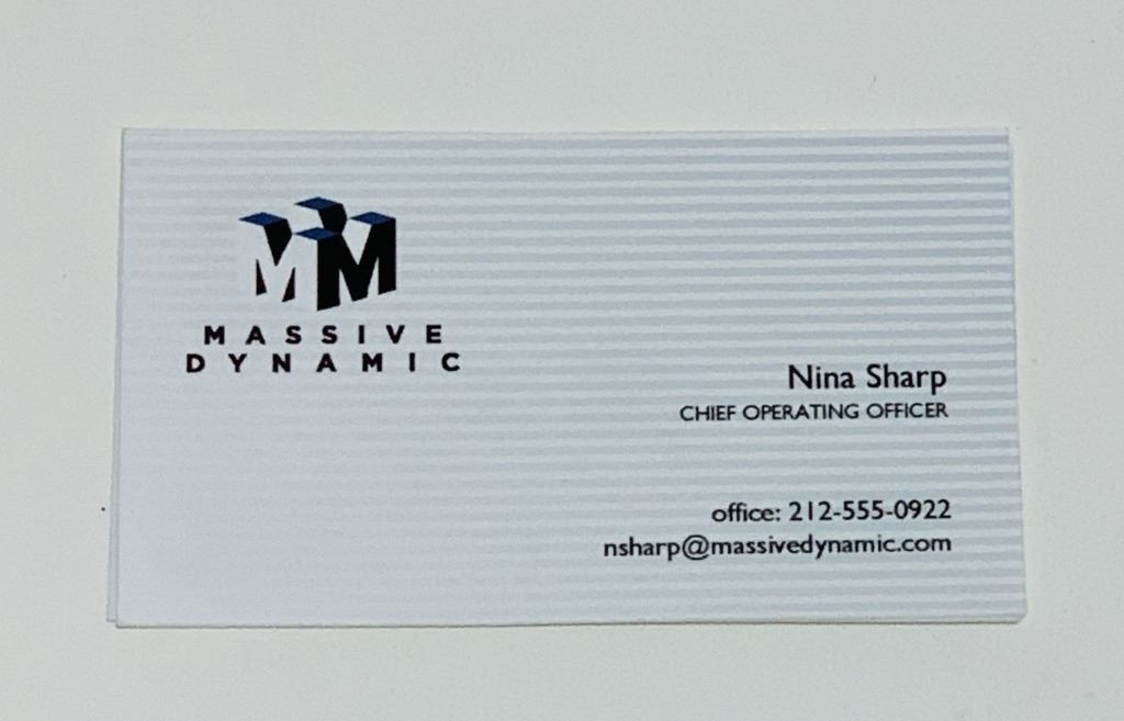 Original Massive Dynamic business card used by "Nina Sharp", played by Blair Brown in the J. J. Abrams created science fiction television series 'Fringe' (2008 - 2013) where, an F.B.I. agent is forced to work with an institutionalized scientist and his son in order to rationalize a brewing storm of unexplained phenomena.