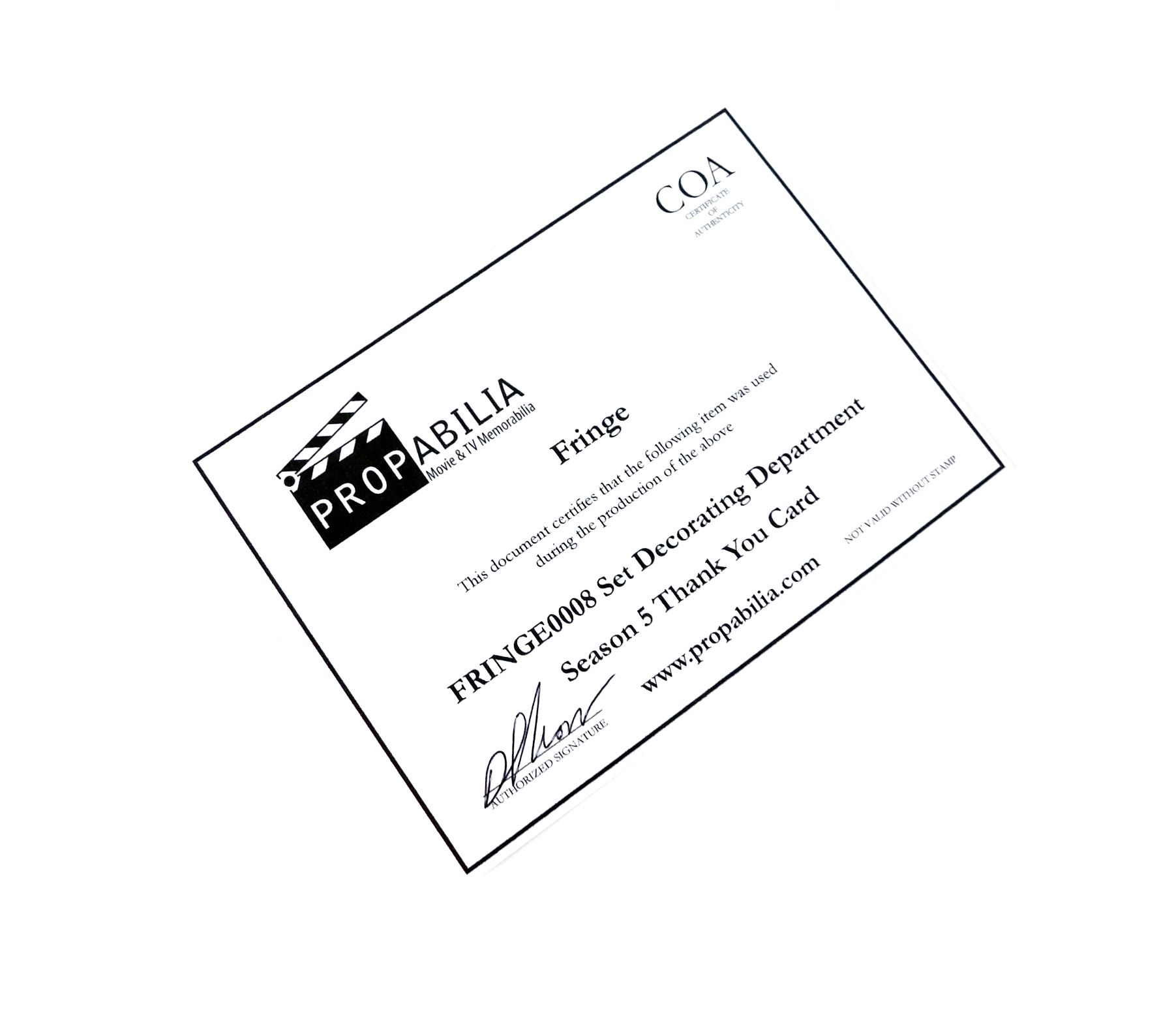 This card was acquired by the production for use in 'Fringe' (Warner Bros, 2008-2013).