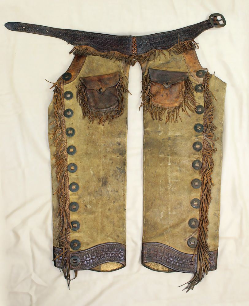 Large pair of early fringed two-tone chaps, with 22 conchos, spectacular fringed pockets and tooled belt. Measures 37” in length.