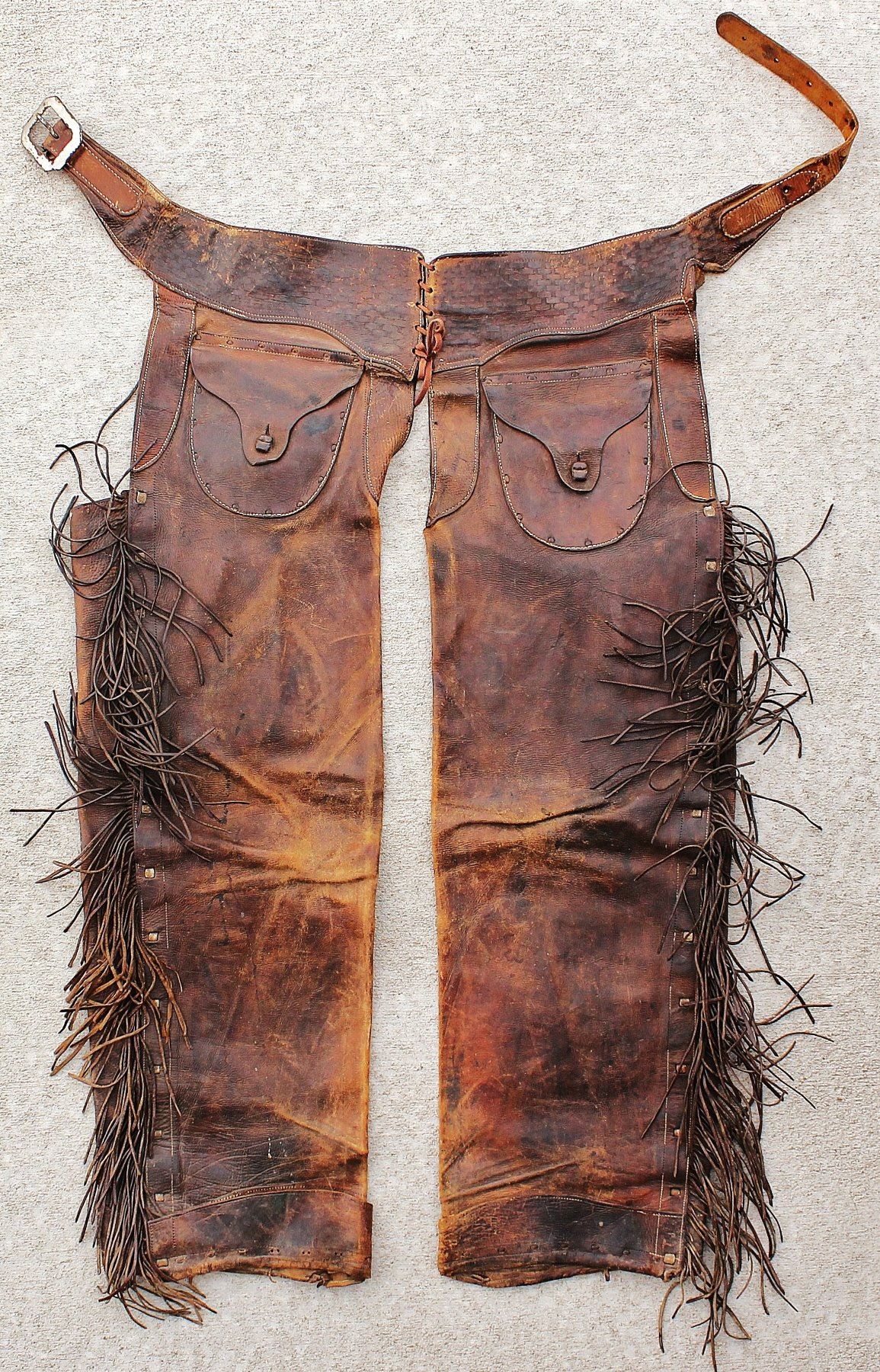 A good looking pair of early spaghetti fringe shotgun chaps with rich color and cowboy character.