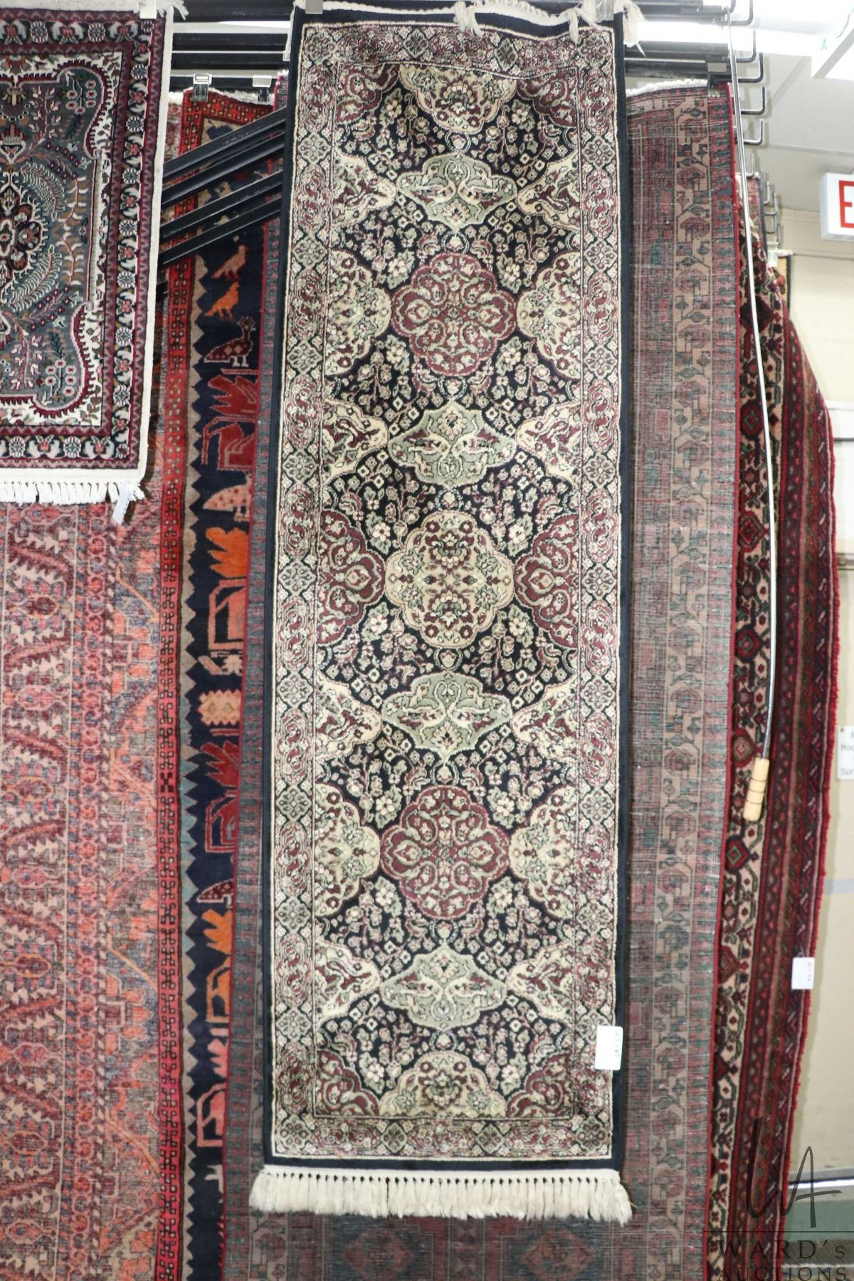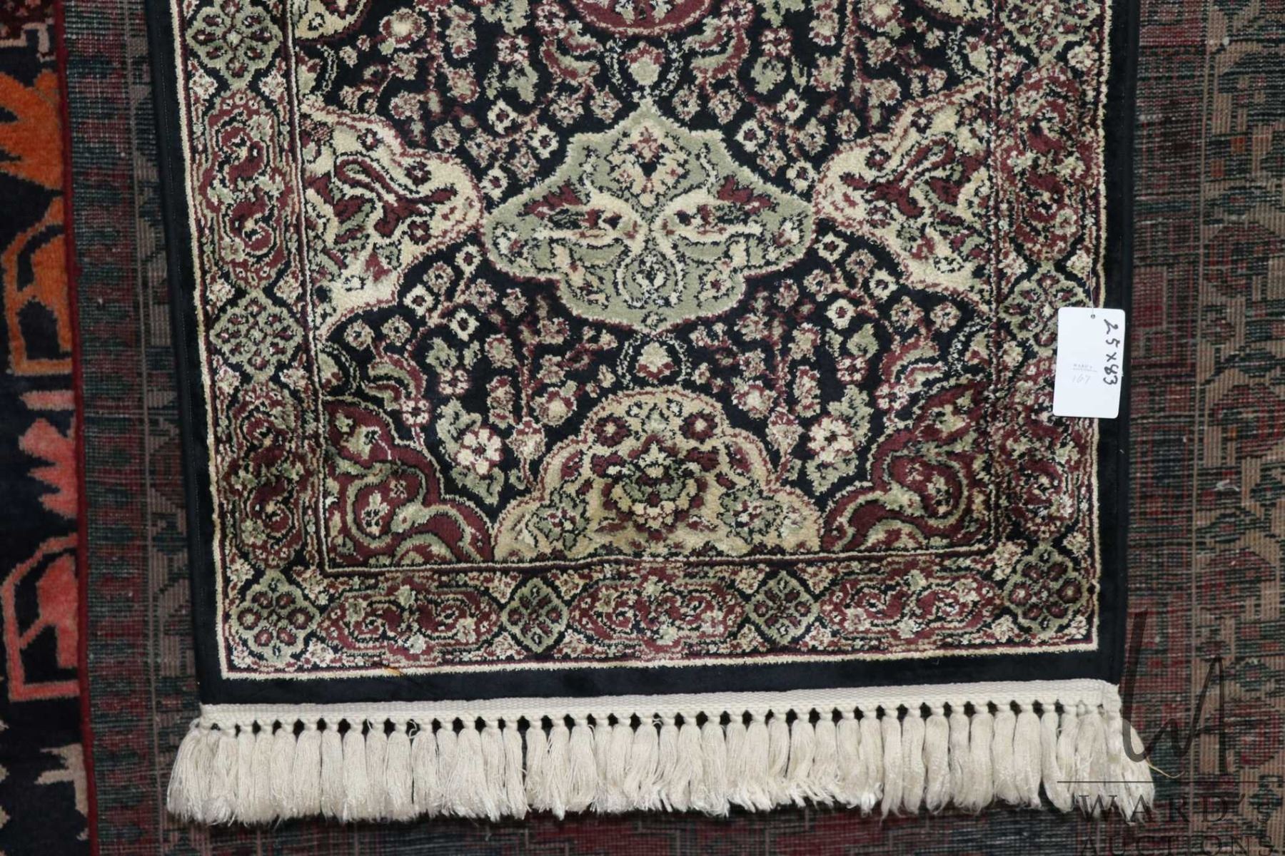 Fringed carpet runner with multiple medallions, floral design and highlights of black, cream, mauve etc. 25" X 83"