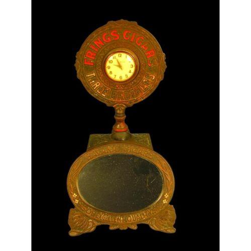 Frings Three Brothers Cigars, Cigar tip cutter with clock and mirror, Cast Iron, all of the nickel gone otherwise good condition, comes with key, 8 x 14 1/2 x 7 inches.
