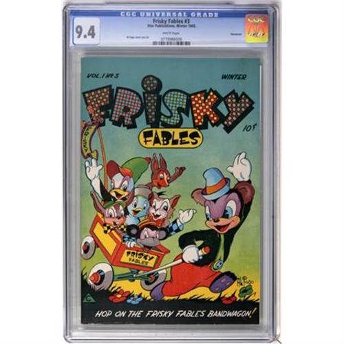 <B>Frisky Fables #3 Vancouver pedigree (Star Publications, 1945) CGC NM 9.4 White pages.</B></I> Funny animal stories. Al Fago cover and art. Overstreet 2007 NM- 9.2 value = $120. CGC census 6/07: 1 in 9.4, none higher.<BR><BR><b>Shipping:</b> Comics - Slabbed (certified) (<a target="_blank" href="http://www.heritageauctions.com/common/shipping.php">view shipping information</a>)