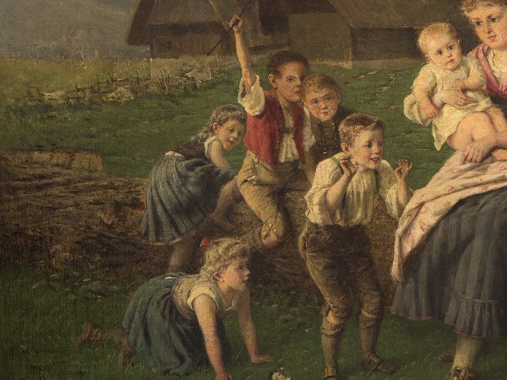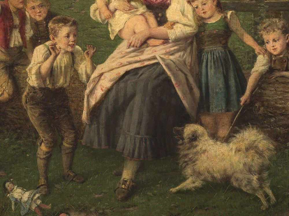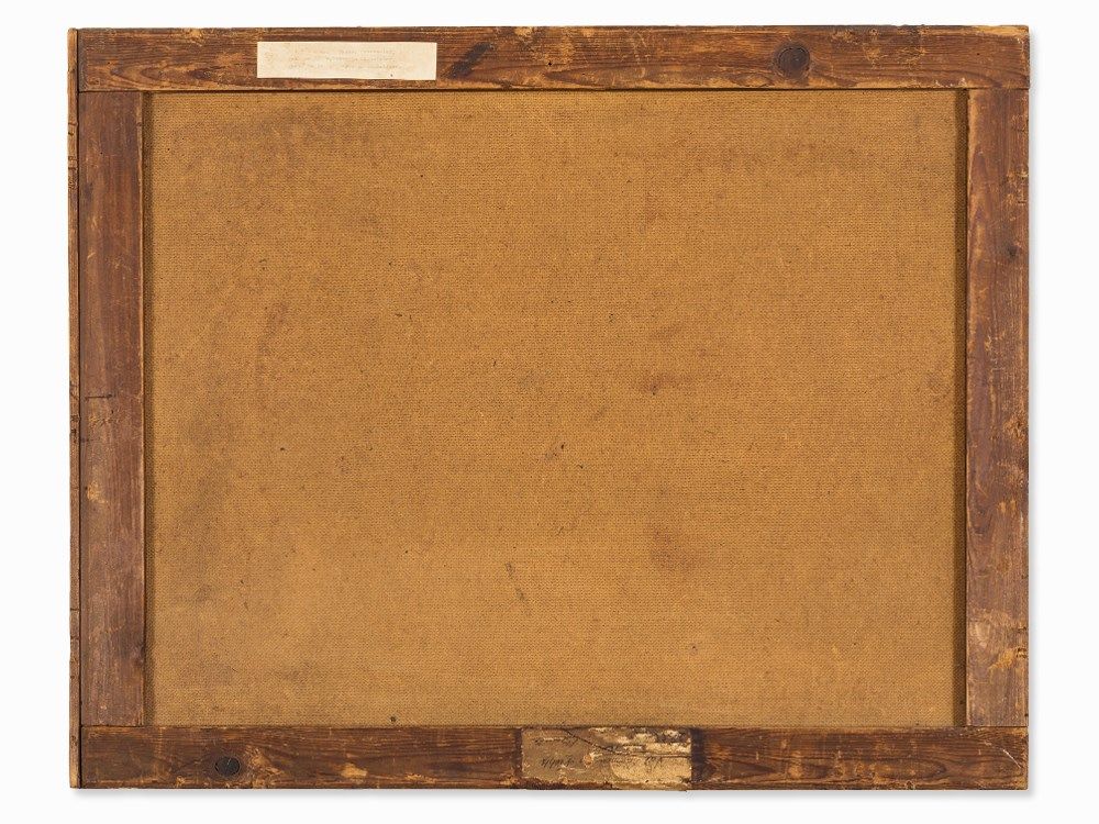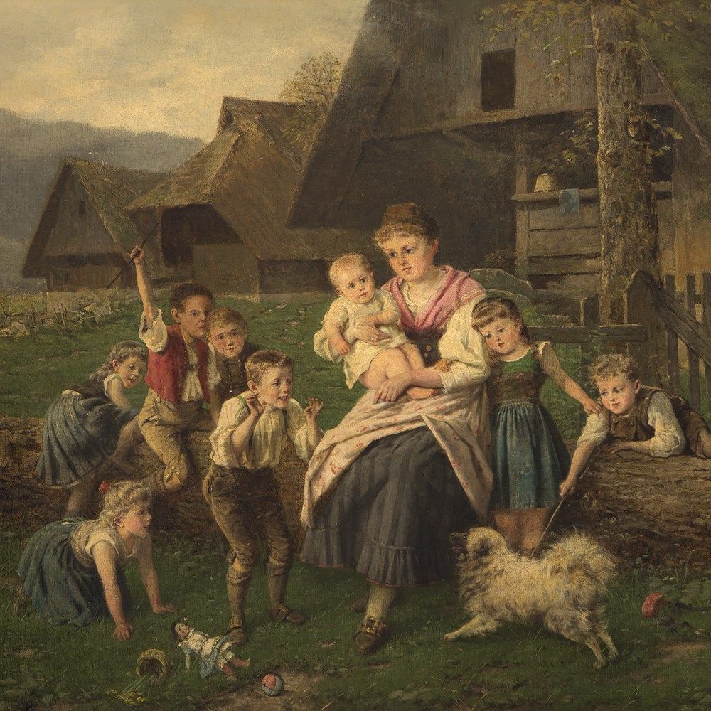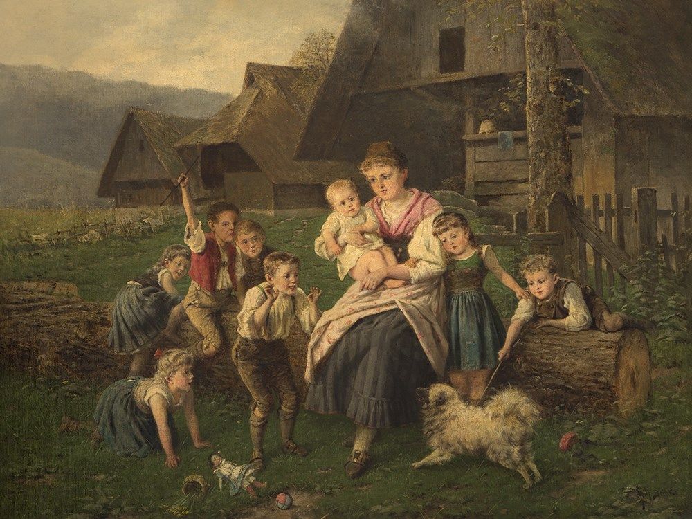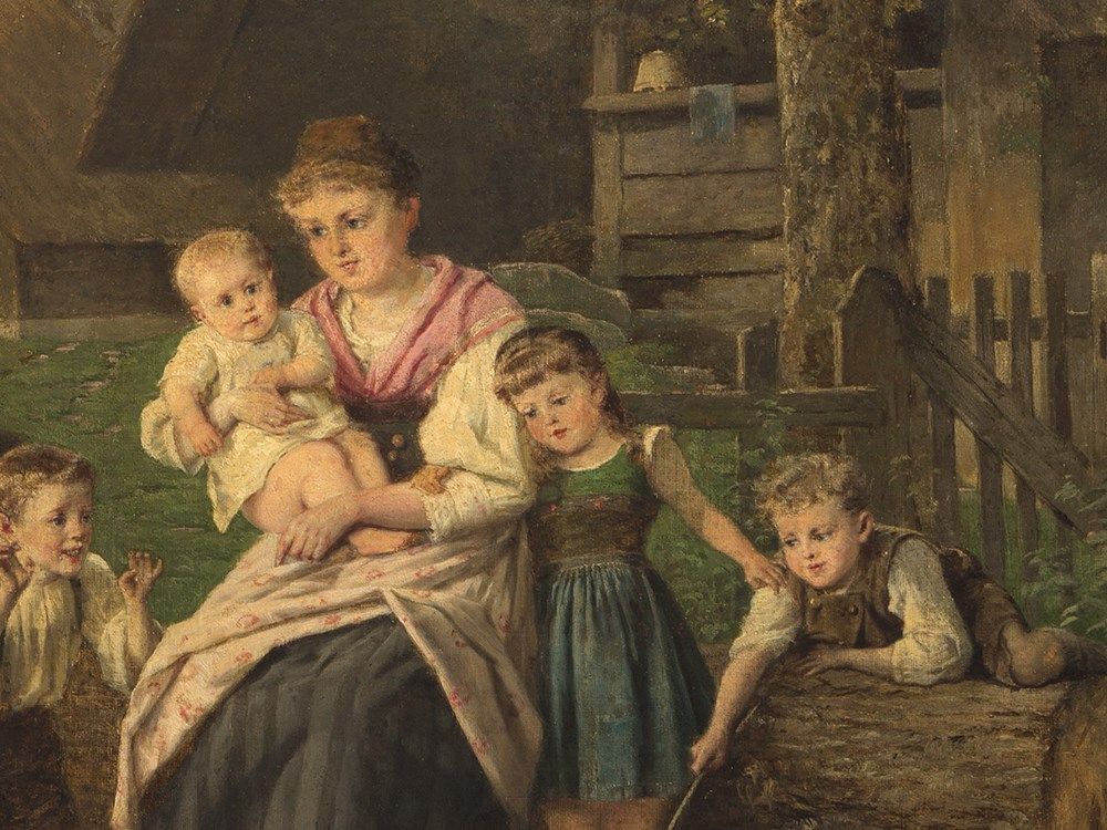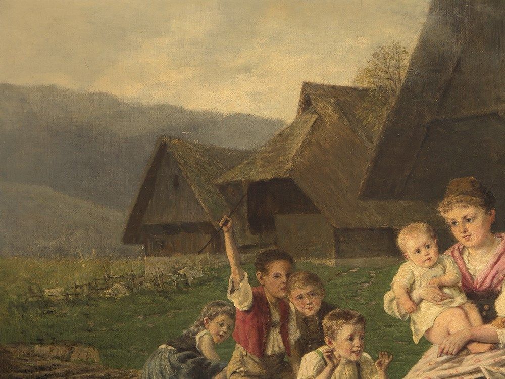 The painting is in good condition considering its age. There are light areas of retouching at the cheek and the eyes of the mother as well as at the eyes of some children. The edges show light marks, where the frame has rubbed and further light areas of retouching. The canvas is slightly dirty due to its age. The wooden frame shows small traces of age and use. The framed work measures 83 x 100 cm and the size of the stretcher measures 65 x 80.5 cm.