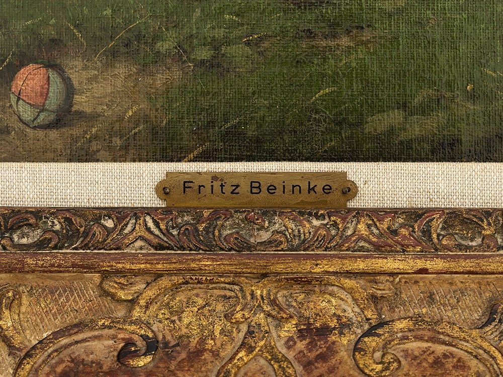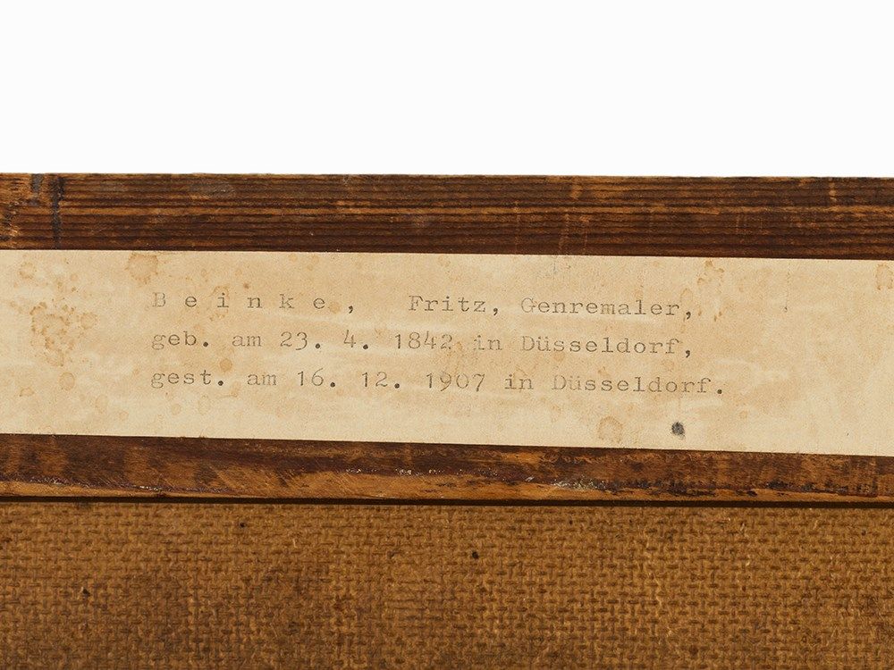 The German painter Fritz Beinke attended the Academy of Arts in Dusseldorf, where he was trained by Karl Ferdinand Sohn (1805-1867) and Eduard Bendemann (1811-1889), amongst others. This was followed by a number of study trips through Germany and Northern Italy. The genre scenes by Ludwig Knaus (1829-1910) revealed an important source of inspiration and finally lead to his specification in genre painting. Fritz Beinke was a follower of the Dusseldorf School and his works are mainly in private hands, today.