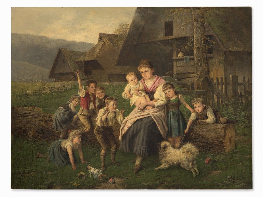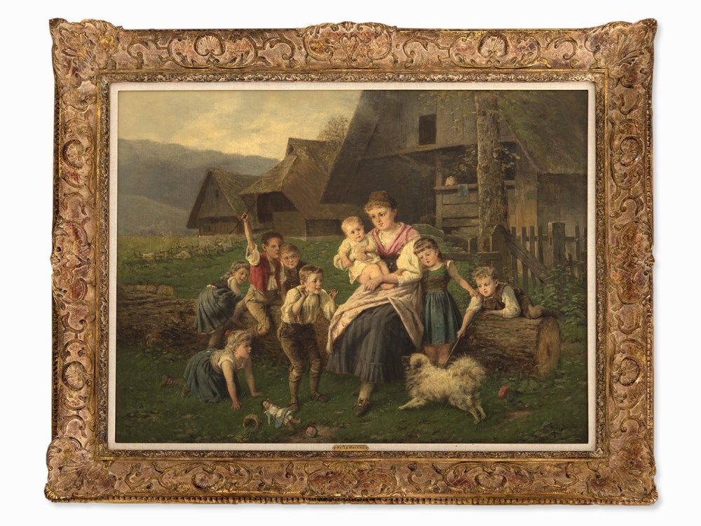 The present painting is a typical genre scene by the German artist Fritz Beinke and was painted around 1900. The work focuses on the family life in the country and depicts a mother with a baby on her lap, watching her children at play with the dog. The romantic depiction is a beautiful example of the artist’s oeuvre, which reflects the artistic approach of the Dusseldorf School.