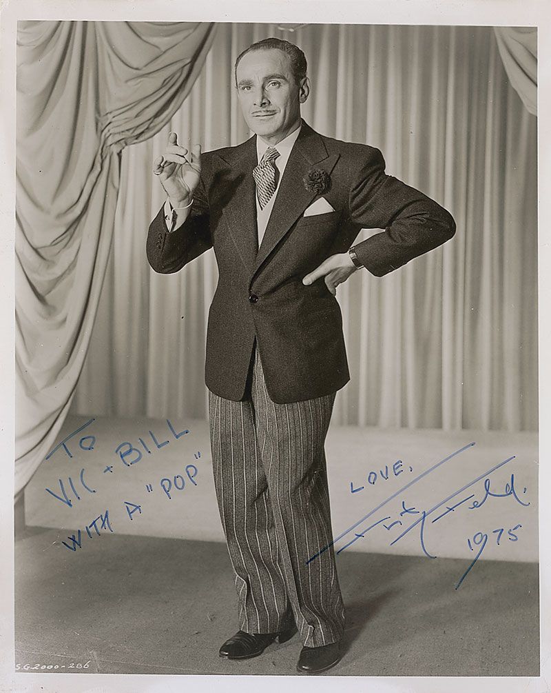 Glossy 8 x 10 full-length photo of Feld striking a pose on stage, signed and inscribed in blue felt tip, “To Vic & Bill, with a ‘pop,’ Love, Fritz Feld, 1975.” In fine condition, with a tiny tear to the left border (not extending into image).