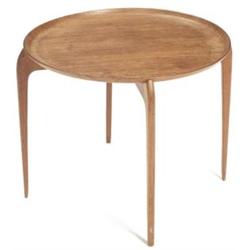 Fritz Hansen tray table, made in Denmark for Raymor, removable teak tray on folding teak base, original finish, stamped “Made in Denmark”, 20.25”dia. x 17”h, excellent condition