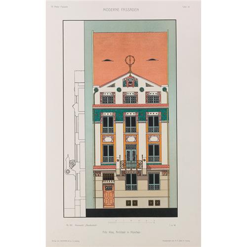 Fritz Klee architectural drawing, colored print of a Moderne Fassaden for the home of H.F.Jütte in Leipzig,8in.x 14in.