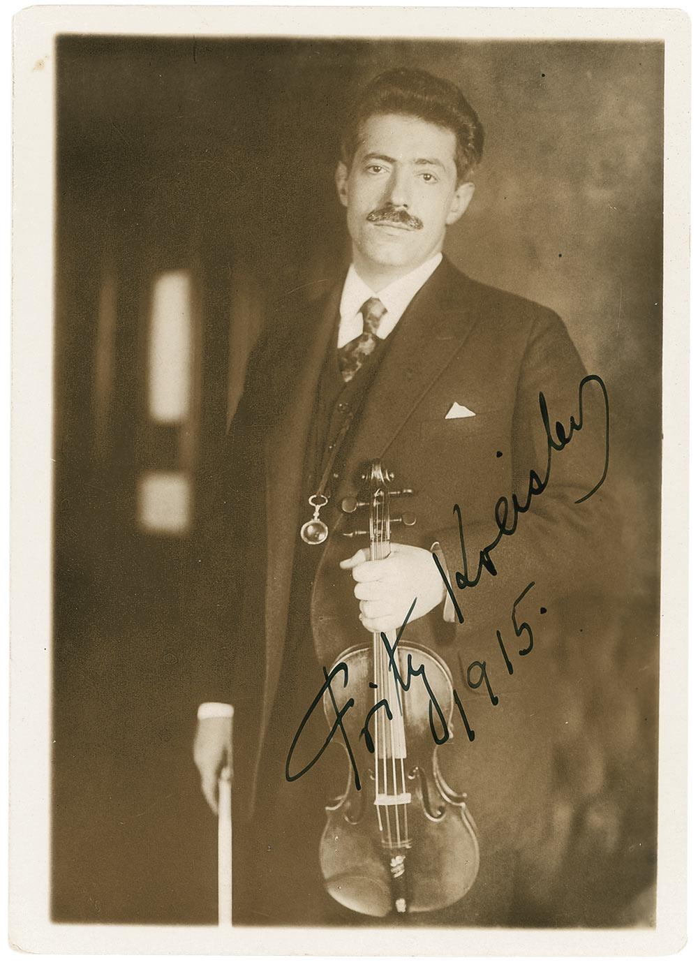 Composer and violinist. Vintage pearl-finish 5 x 6.75 photo of Kreisler holding his violin, signed in fountain pen, “Fritz Kreisler 1915.” In fine condition, with some scattered light surface marks. RRAuction COA.