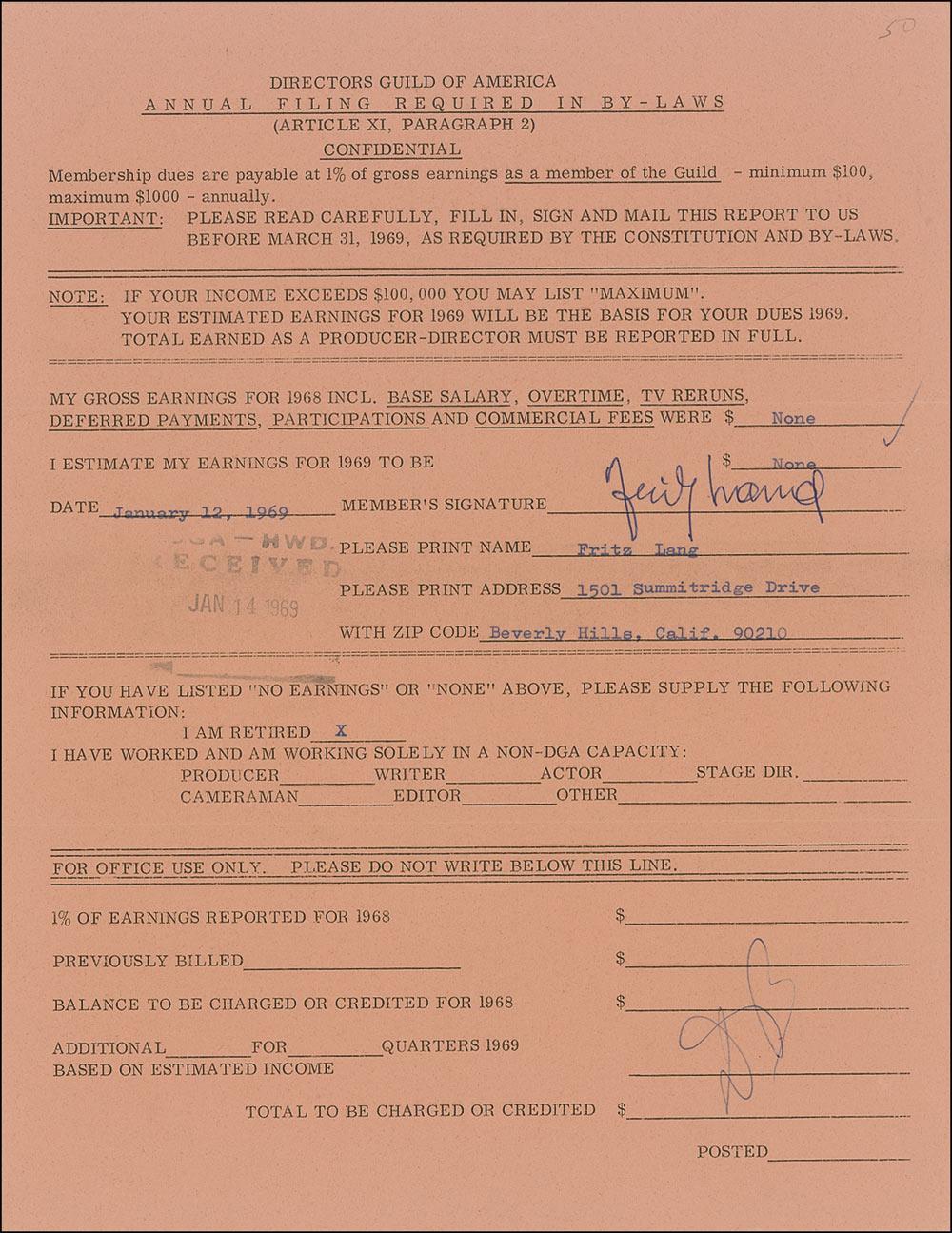 Esteemed German-American film director (1890–1976) who helmed such classics as Fury, and the landmark science-fiction epic Metropolis. DS, one page, 8.5 x 11, January 12, 1969. Directors Guild of America income filing, with Lang stating no earnings for 1968 and estimating his earnings for 1969 as none, as the “retired” box has been selected in the bottom portion of the document. In fine condition, with an office stamp to left side and a couple ink notations. Although not realized in his lifetime, Lang was heralded as playing an integral part in the evolution of American cinema, while helping to establish the fundamental characteristics of film noir weaving threads of psychology, paranoia, fate, conflict and moral ambiguity through his works.