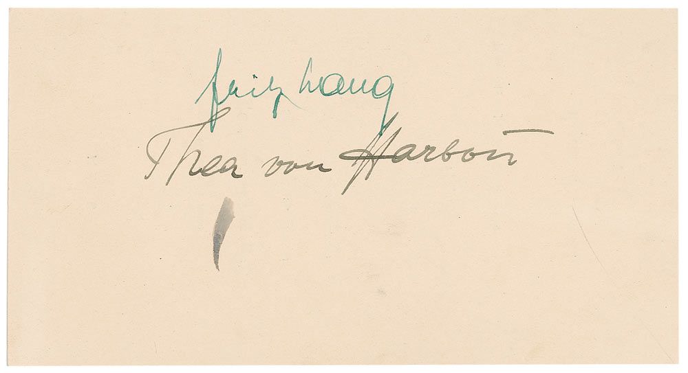 Esteemed German-American film director (1890–1976) who helmed such classics as Fury, and the landmark science-fiction epic Metropolis. Menu from the Autoklub restaurant, 8 x 4.25, signed on the reverse in fountain pen, “Fritz Lang.” Show-through from the menu print, collector’s notation written vertically alongside menu print, and another autograph below Lang’s signature, otherwise fine condition.