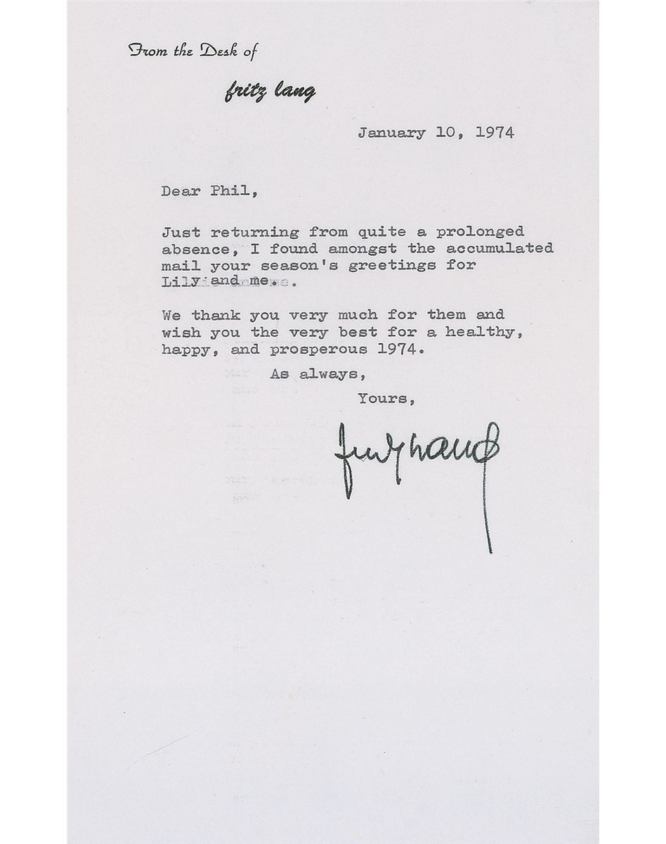 TLS, one page, 5.25 x 8.5, personal letterhead, January 10, 1974. Letter to a friend. In part, “Just returning from quite a prolonged absence, I found amongst the accumulated mail your season’s greetings for Lily and me.” In fine condition.