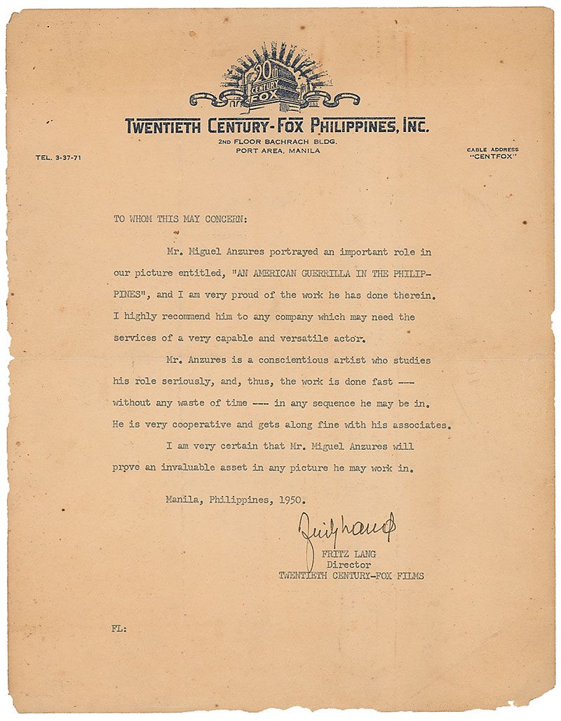 Esteemed Austrian-American film director (1890–1976) who helmed such classics as Fury and the landmark science-fiction epic Metropolis. TLS, one page, 8.5 x 11, Twentieth Century Fox Philippines letterhead, no date. Letter of introduction and recommendation for an actor named Miguel Anzures. In part: “Mr. Miguel Anzures portrayed an important role in our picture entitled ‘An American Guerrilla in the Philippines,’ and I am very proud of the work he has done therein. I highly recommend him to any company which may need the services of a very capable and versatile actor. Mr. Anzures is a conscientious artist who studies his role seriously, and thus, the work is done fast—without any waste of time.” In very good condition, with intersecting folds, mild toning, and scattered light foxing, creasing and edge wear.