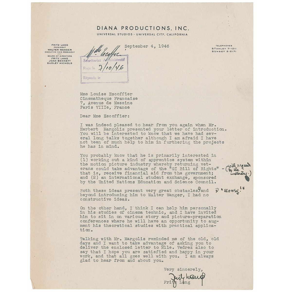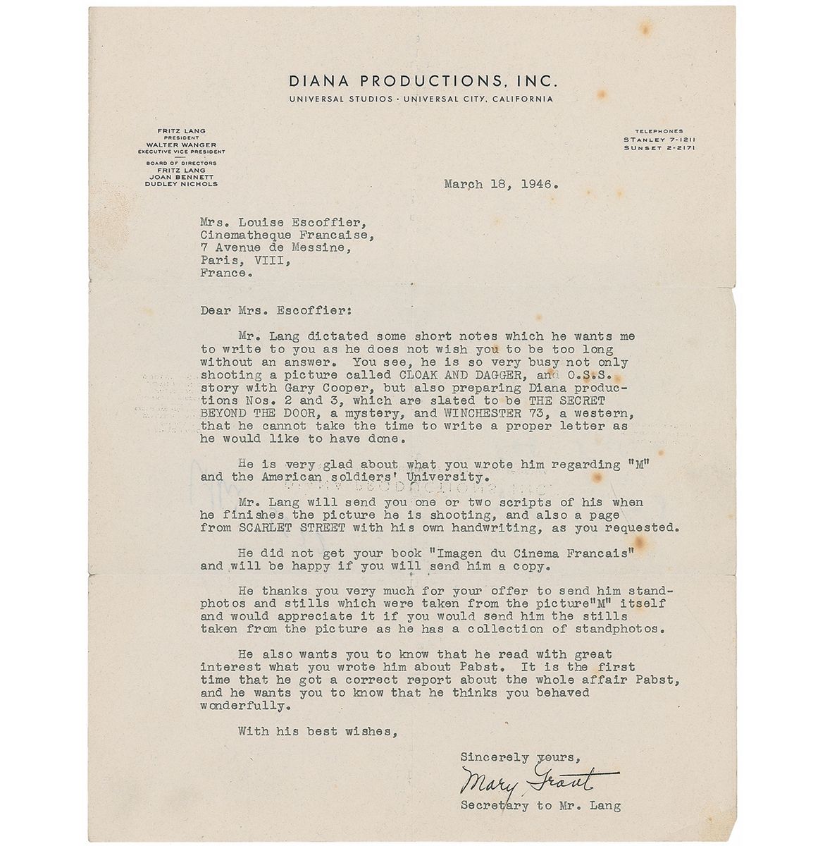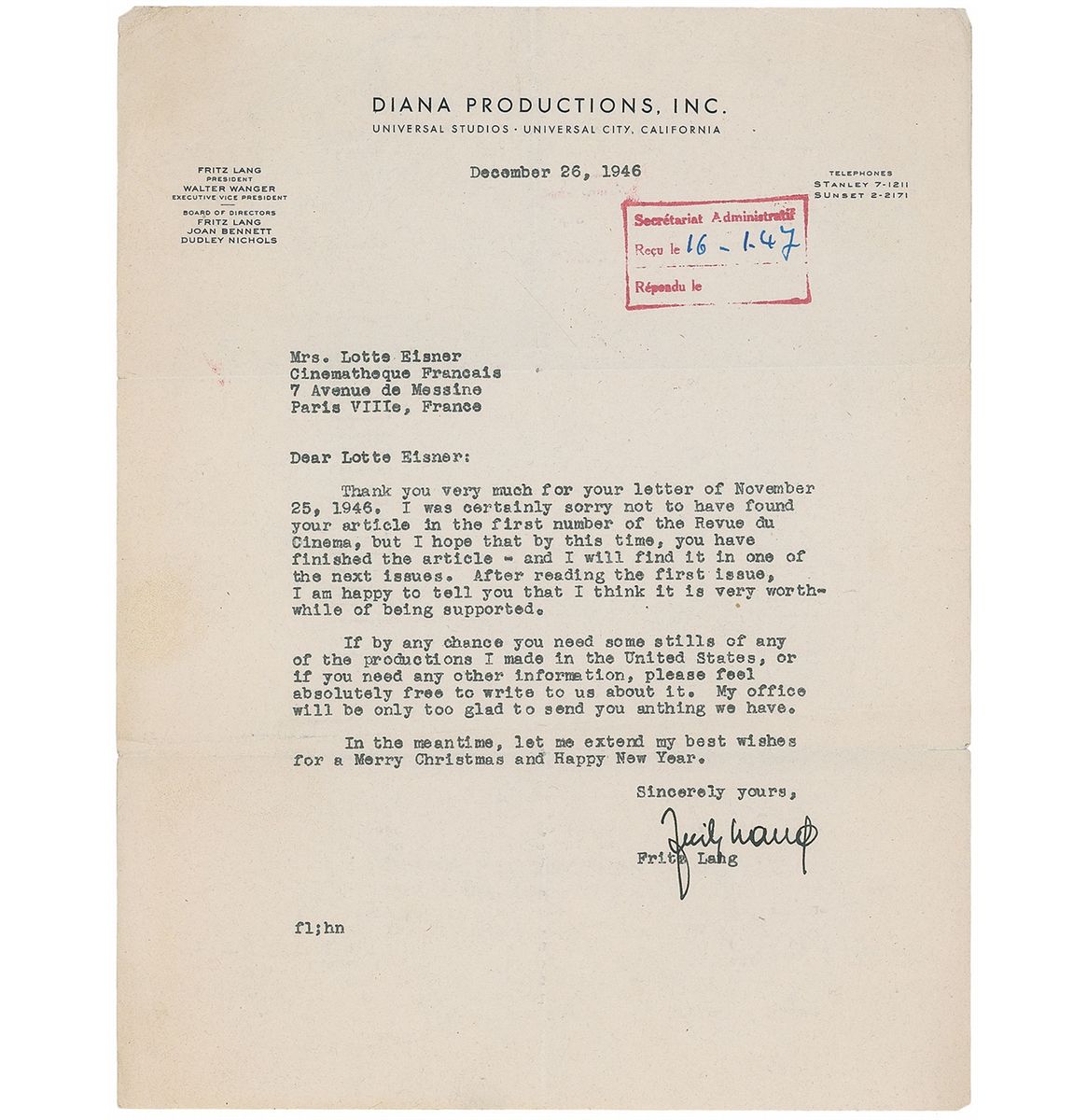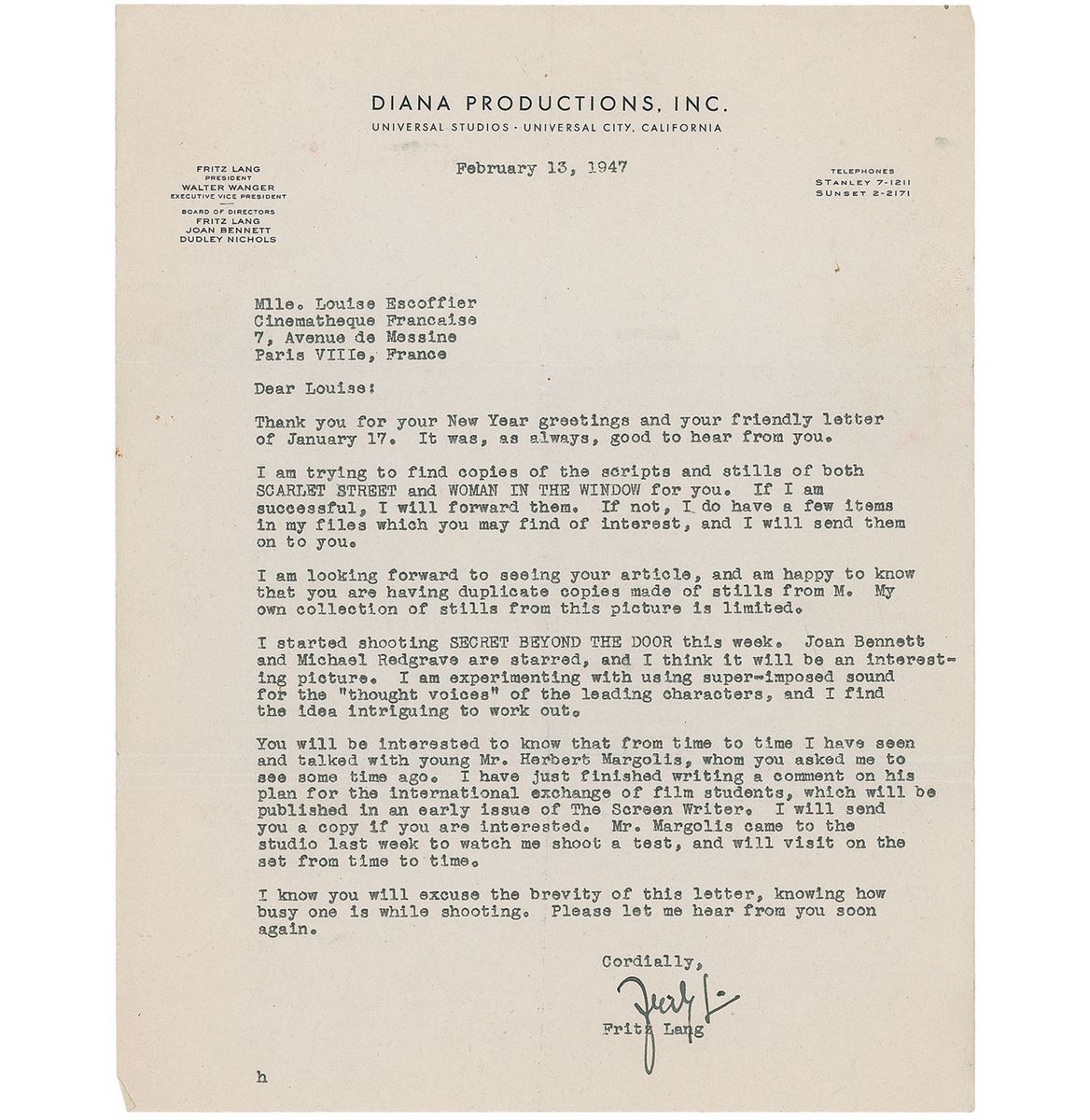 Esteemed Austrian-American film director (1890–1976). Three TLSs to the film historian Lotte Eisner, two signed “Fritz Lang” and one signed “Fritz L.,” each one page, 8.5 x 11, Diana Productions, dated 1946–47. The first, in part: “Mr. Herbert Margolis…is primarily interested in (1) working out a kind of apprentice system in the motion picture industry whereby returning veterans could take advantage of the ‘GI Bill of Rights’…and (2) an international student exchange”; Lang also makes a few handwritten revisions to this letter. In the second, Lang offers to supply “stills of any of the productions I made in the United States.” The third, in part: “I am trying to find copies of the scripts and stills of both Scarlet Street and Woman in the Window for you. If I am successful, I will forward them. If not, I do have a few items in my files which you may find of interest, and I will send them on to you…I started shooting Secret Beyond the Door this week. Joan Bennett and Michael Redgrave are starred, and I think it will be an interesting picture. I am experimenting with using super-imposed sound for the ‘thought voices’ of the leading characters, and I find the idea intriguing to work out.” Intersecting folds and light scattered creases, otherwise overall fine condition. Accompanied by another letter from Lang’s secretary.