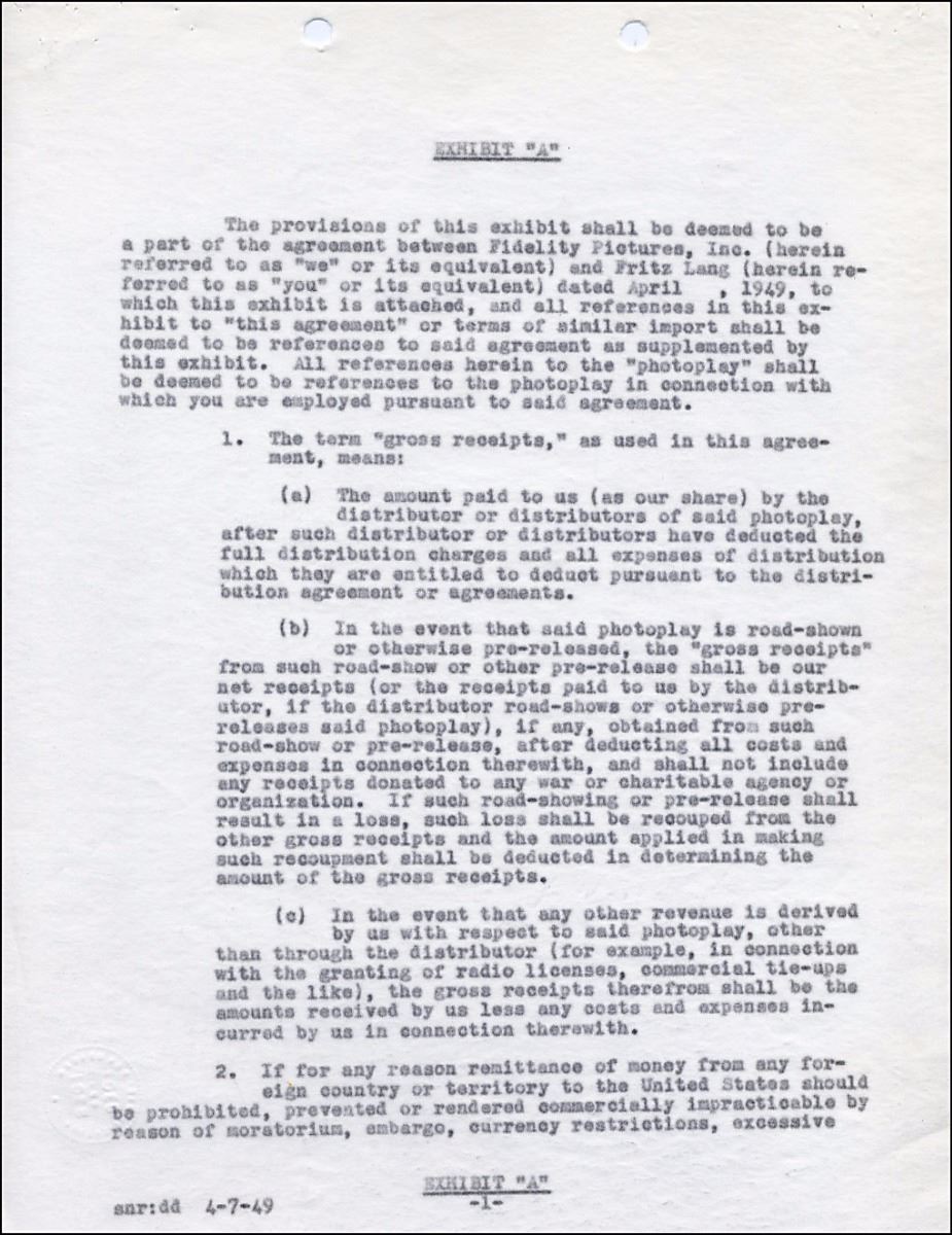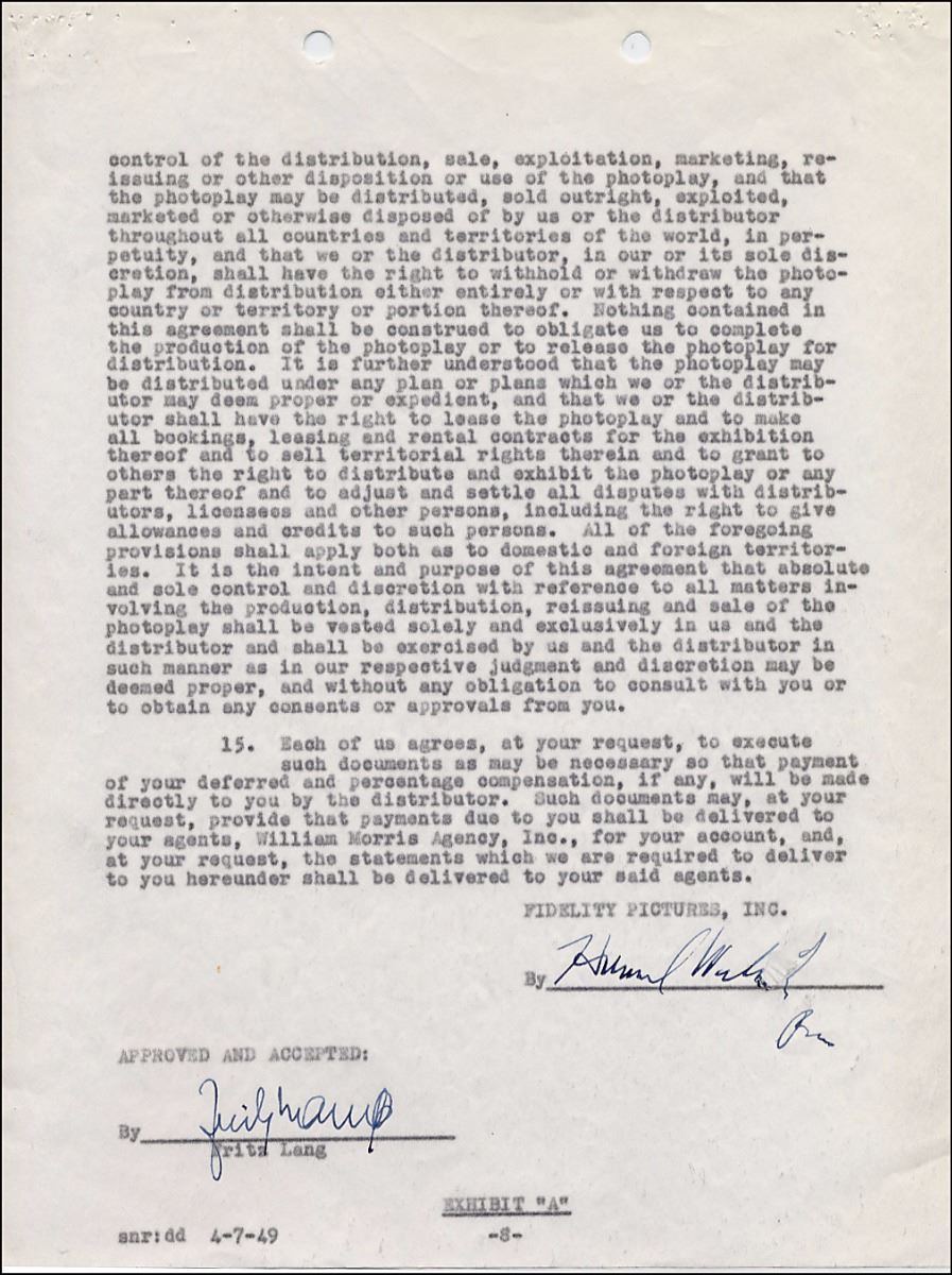 DS, eight pages, 8.5 x 11, April 7, 1949. Exhibit ‘A’ document clarifying provisions of another contract between Lang and Fidelity Pictures, primarily concerning the definition of “gross receipts” in relation to an unspecified photoplay. Nicely signed on the last page in fountain pen by Lang. In fine condition.