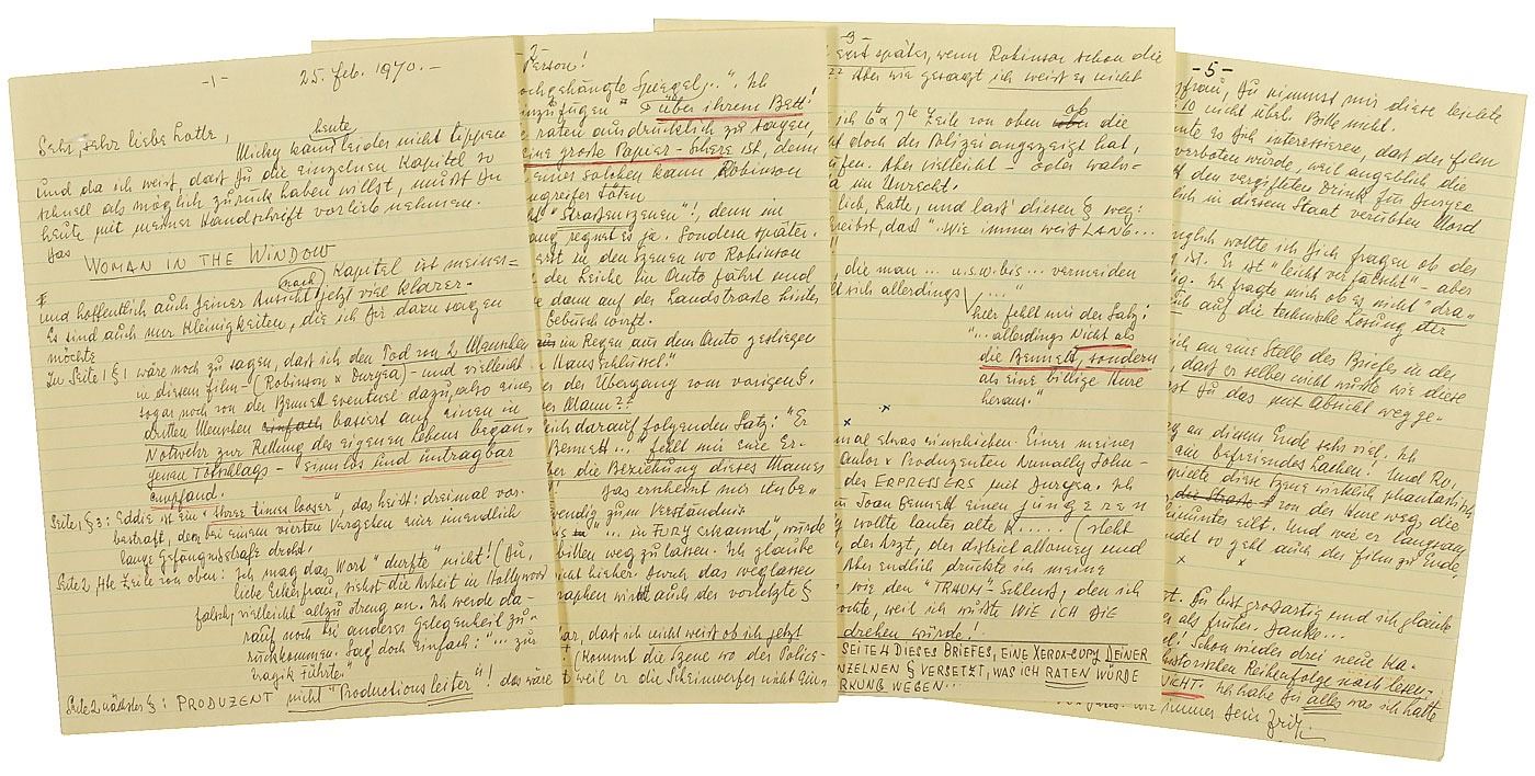 ALS in German, four pages, lightly-lined, 8.5 x 11, February 25, 1970. Letter to Lotte H. Eisner with detailed comments, corrections, and additions on his film “Woman in the Window” for the corresponding chapter in his biography. In part (translated): “The Woman In The Window chapter in my and, hopefully, your view is much clearer for now. There are only little things that I want to tell you this. To page I, Section I, would have to say that I am the deaths of 2 men in this film (Robinson & Duryea)—and perhaps even eventually by Bennett to a third person, therefore - based on a self-defense to save the own life, committed manslaughter—pointless and unbearable feeling. Eddie is a 'three times looser,' that is, three convictions, the threat of a fourth offense a long prison sentence.—I like the word, was not allowed '! (You, dear Mrs. Ecker, are working in Hollywood, incorrectly, perhaps too strict. I will come back to that on another occasion…Scenes where Robinson with the corpse in the car drives and then throws on the road behind a bush. The man who has risen in the rain out of the car has a front door key. The woman who tries to avoid it, but would have…here I miss the proposition, but not than Bennett, but as a cheap whore out…Here I would now like to insert something once. One of my main struggles with the author and producer Nunnally Johnson, the occupation of the blackmailer with Duryea was. I wanted as an opponent for Joan Bennett have a younger man! Nunnally wanted nothing but old…But at last I pressed my occupation rotate through, as well as the "DREAM" conclusion which I also really liked just because I know HOW I BECAME THE TRANSITIONAL would SCENE! By the way, it might interest you to know that the film was banned in the U.S. because the allegedly scene where the Bennett scrambles the poisoned drink for Duryea, in a truly committed murder in that State […] I was reminded at this end a lot. I needed a liberating laughter! And Robinson played this scene really fantastic if he, by the whore away, hurrying down the street. And as he slowly disappears and the film comes to an end.” In fine condition, with staple hole to each page and several underlined lines of text. Accompanied by a one-page copy of the manuscript, which features various handwritten emendations by Lang. An interesting letter not just for the cinematic oeuvre of the director, but also a deep insight into his artistic intentions and feelings, as well as opinions on Hollywood and American cinema.