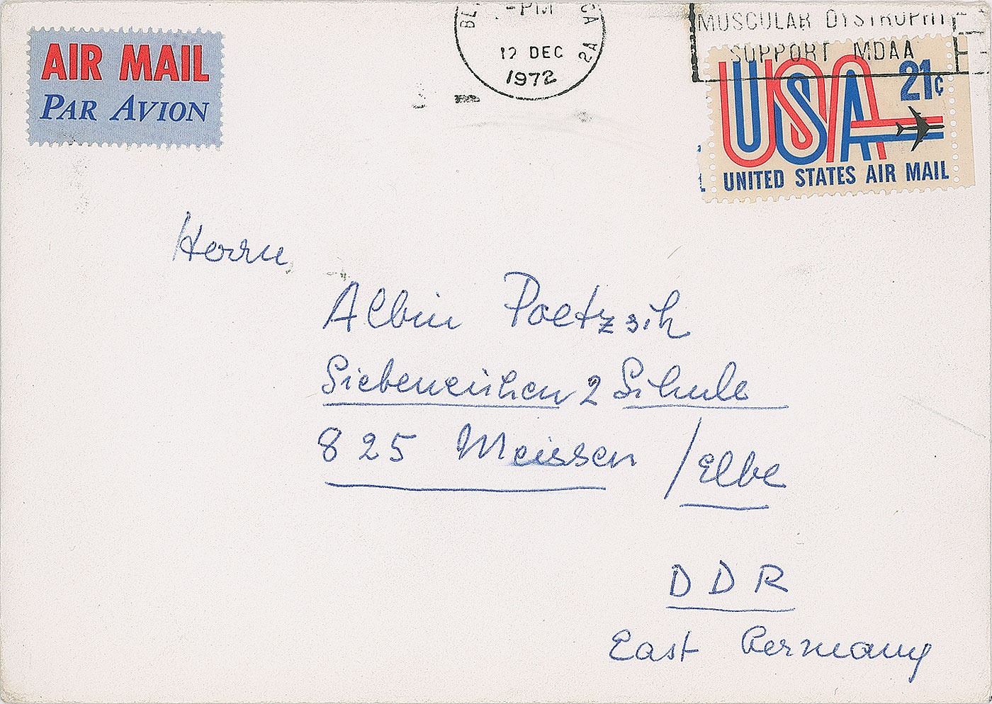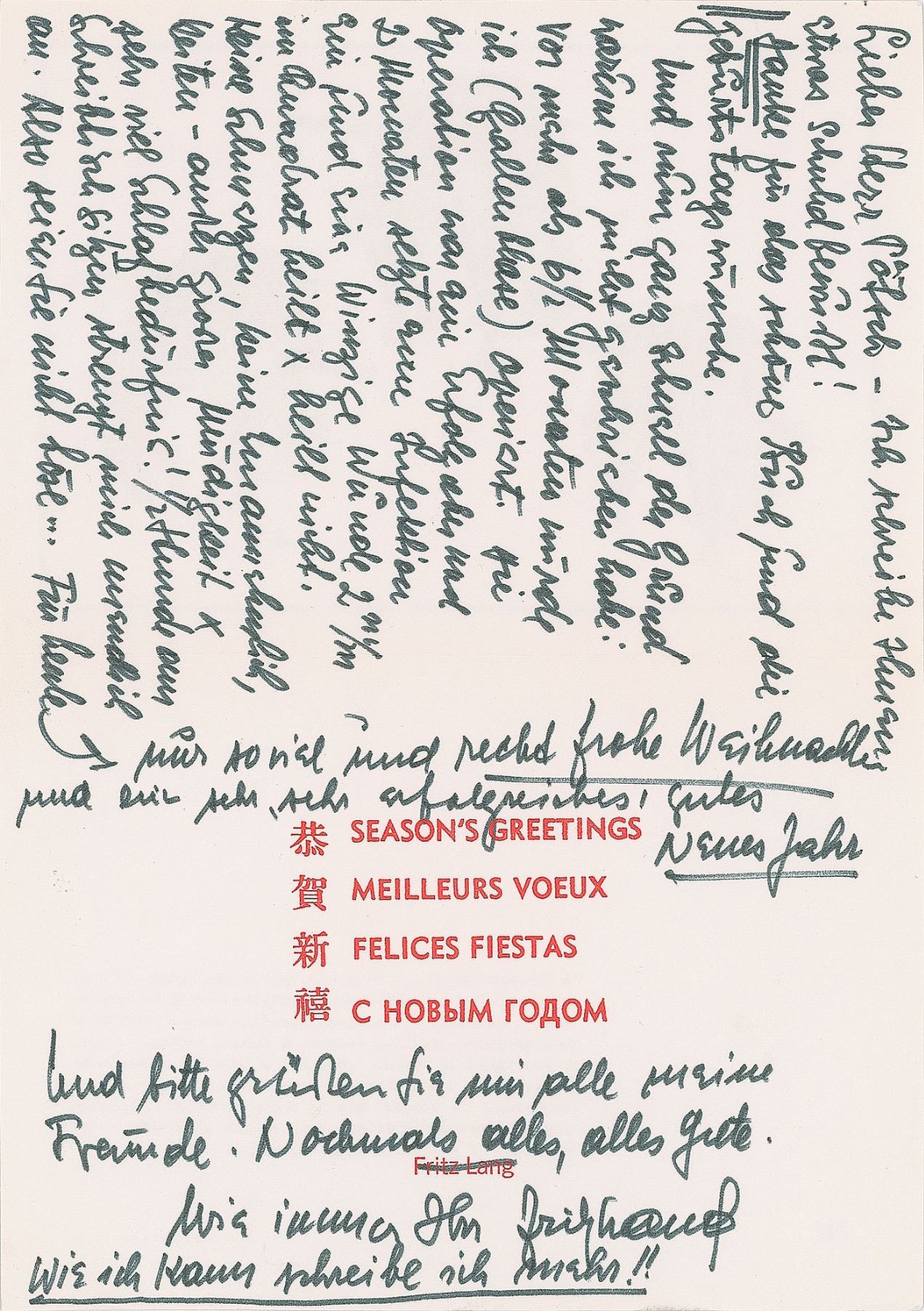 ALS in German, written inside a 4.25 x 6 card, postmarked December 12, 1972. Letter to film journalist Albin Poetzsch, in part (translated): "I am writing something to you guiltily! Thanks for the nice book and the birthday wishes. And now quite fast the reason why I did not write: I was operated on more than 6 1/2 months ago (gallbladder). The operation was a success but after 2 months an infection set in and a tiny 2mm wound did not heal. No pain, no inconvenience except great fatigue and a lot of sleep. Sitting at the desk for 1/2 hour makes me endless tired. So please do not be angry…For today only so much: Merry Christmas and a very very successful new year!" In fine condition. Accompanied by the original mailing envelope.