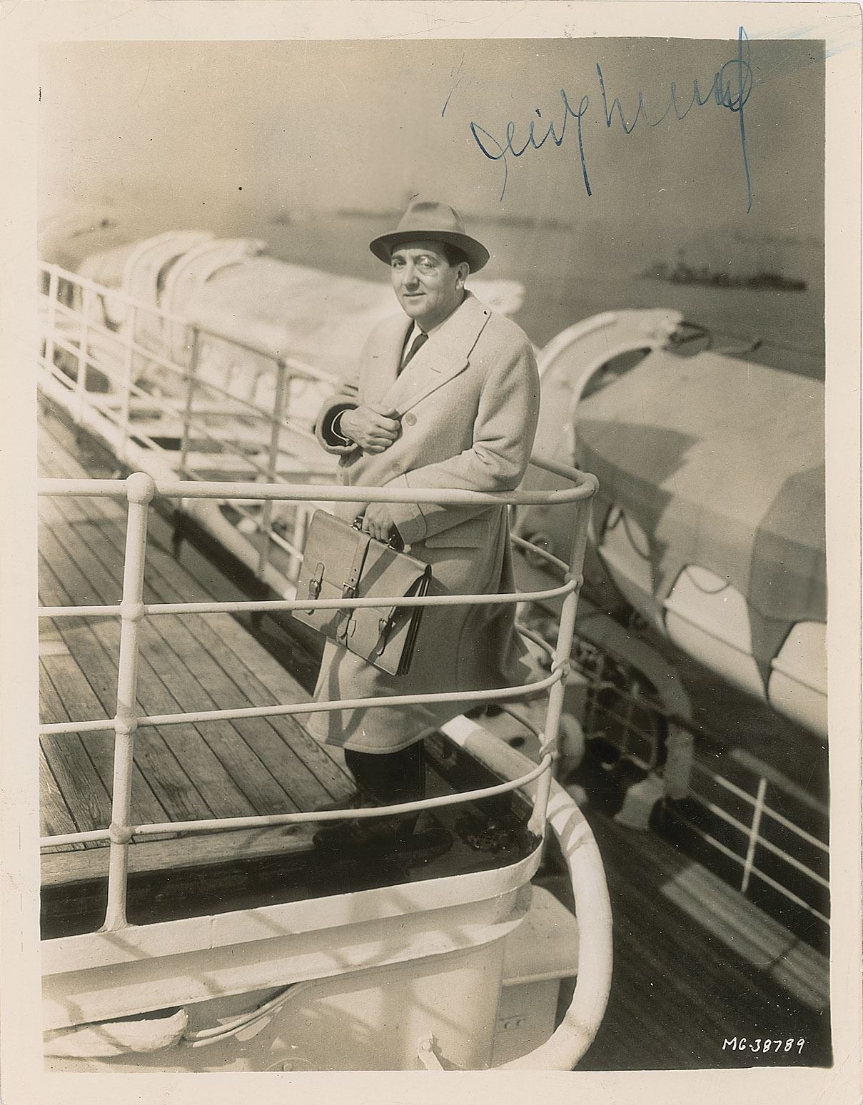 Vintage glossy 8 x 10.25 MGM publicity photo of Fritz Lang with monocle and briefcase leaning on the railing of a ship, signed in fountain pen. Reverse bears typed and affixed captions, with stamped date to upper right, "Jun 27, 1934." In very good to fine condition, with scattered light creasing, and some rippling from affixed info on the reverse.