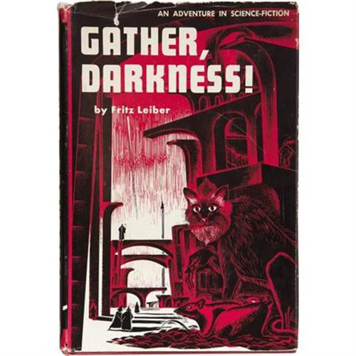 <B>Fritz Leiber. </B></I><B><I>Gather, Darkness!</B></I></B></I> New York: Pellegrini & Cudahy, 1950. <BR>First edition. Octavo. 240 pages.<BR><BR>Publisher's red cloth with red titles against a black background on the spine. Corners bumped. Light shelf wear. Contents slightly toned. Dust jacket with light chipping at the edges, especially at the head and foot of the spine. Light shelf wear. Very good. <I>From the Robert and Diane Yaspan Collection.</B></I><BR><BR><b>Shipping:</b> Books & Catalogs (<a target="_blank" href="http://www.heritageauctions.com/common/shipping.php">view shipping information</a>)