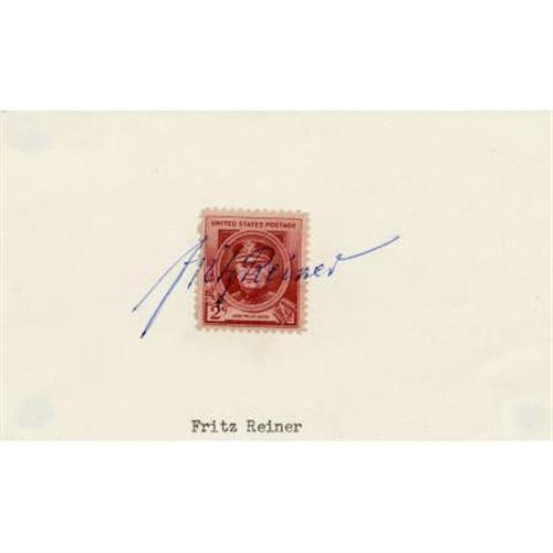 <B>Fritz Reiner Autograph.</B></I> A 5" x 3" card, with a two-cent postage stamp affixed, signed by the celebrated conductor in blue ink. Reiner's autograph extends across the face of the stamp and is legible and clean. In Excellent condition.<BR><BR><b>Shipping:</b> Flat Material, Small (<a target="_blank" href="http://www.heritageauctions.com/common/shipping.php">view shipping information</a>)