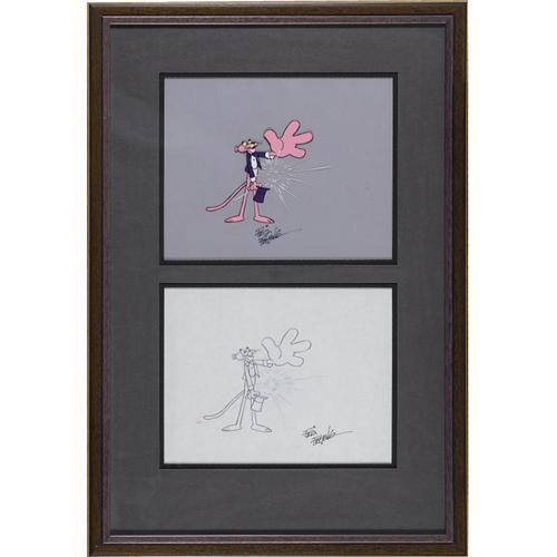 <B>Friz Freleng - Pink Panther Animation Cel and Production Drawing Original Art (undated).</B></I> Pinky performs some slight-of-hand trickery in this charming cel and drawing presentation. Both the full-color cel and the pencil drawing have been signed in ink by Friz Freleng. Each piece measures approximately 12" x 10"; matted and framed to an overall size of 20" x 29.5", in Excellent condition. Think Pink! <BR><BR><b>Shipping:</b> Framed - with Glass, Large (<a target="_blank" href="http://www.heritageauctions.com/common/shipping.php">view shipping information</a>)