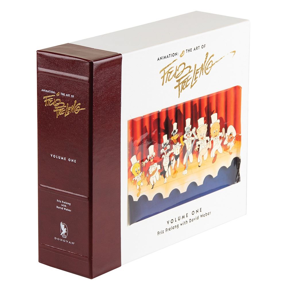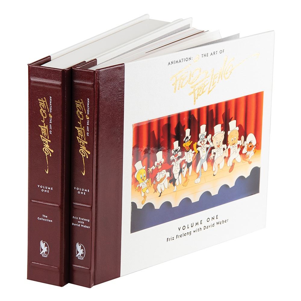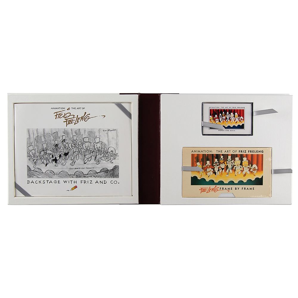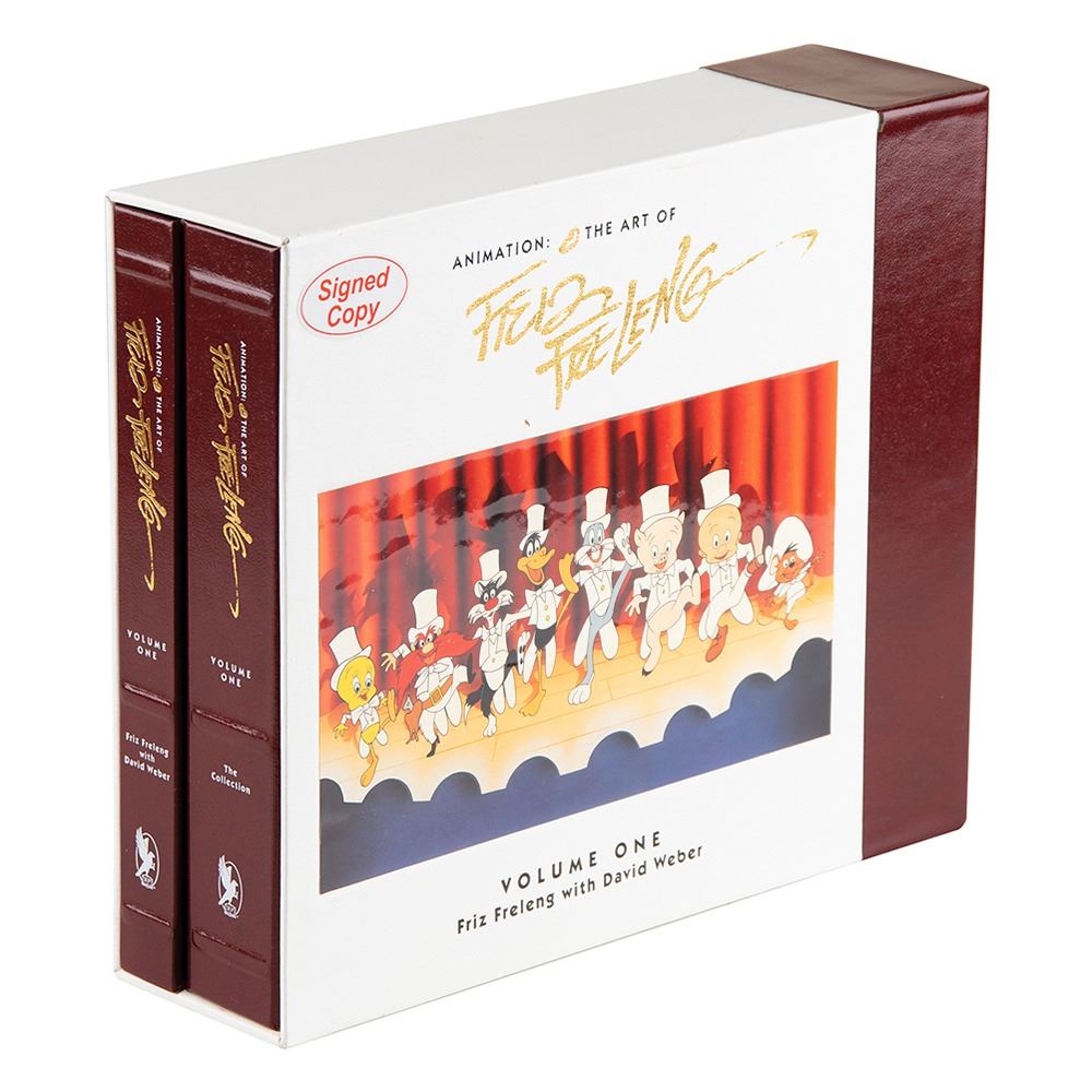 Signed book: Animation: The Art of Friz Freleng. First edition, limited issue, numbered 537/4000. Newport Beach, CA: Donovan Publishing, 1994. Hardcover, 11.5 x 9.5, 239 pages. Signed on an opening hologram page in black felt tip by Friz Freleng. The set includes one book examining the life and creative genius of Friz Freleng, and one set containing an animator's workbook, an audio tape entitled Animation: The Art of Friz Freleng, Words and Music, and a video tape entitled Freleng: Frame by Frame. In very good to fine condition, with a few edge tears to the label on the slipcase and a "Signed Book" label to the slipcase.
