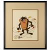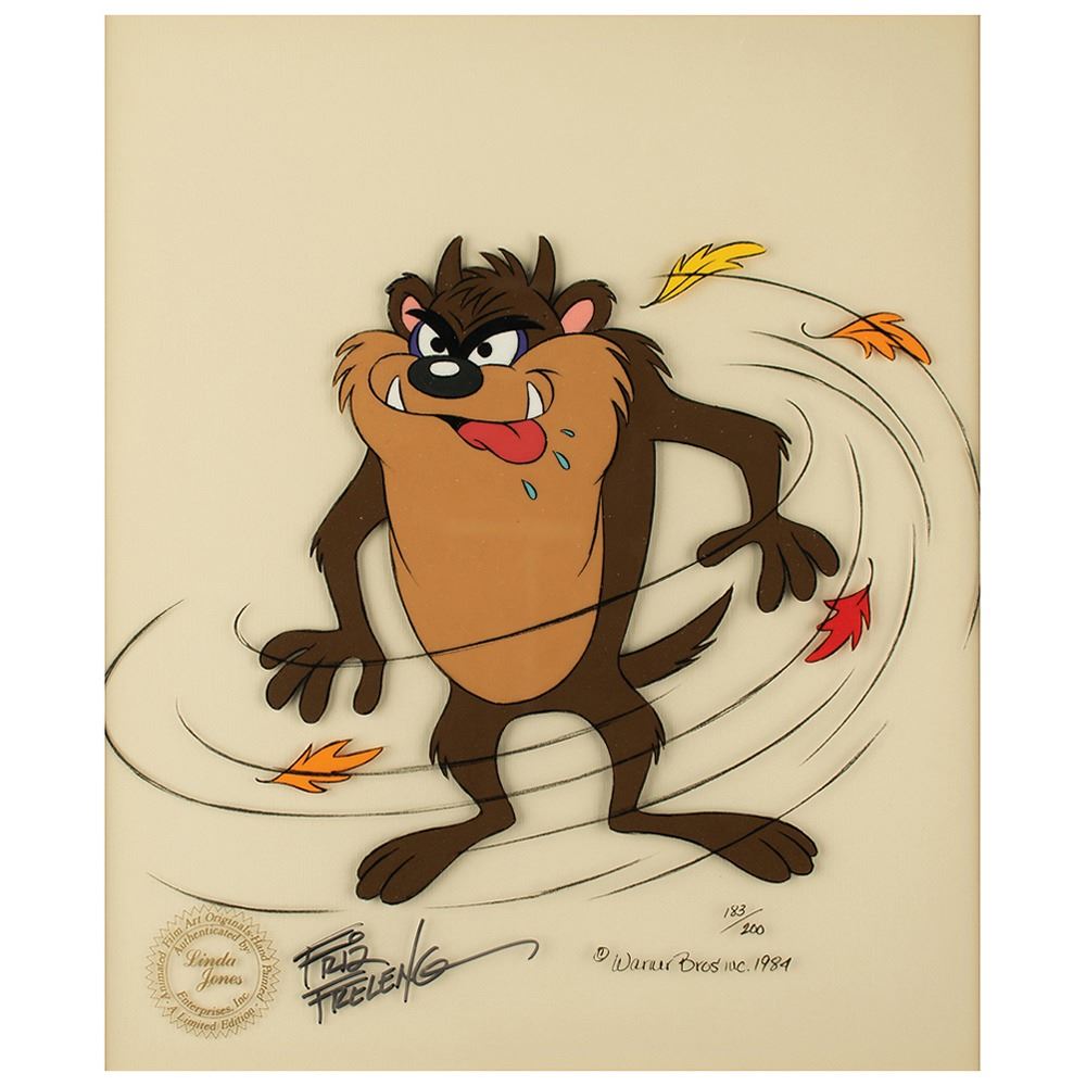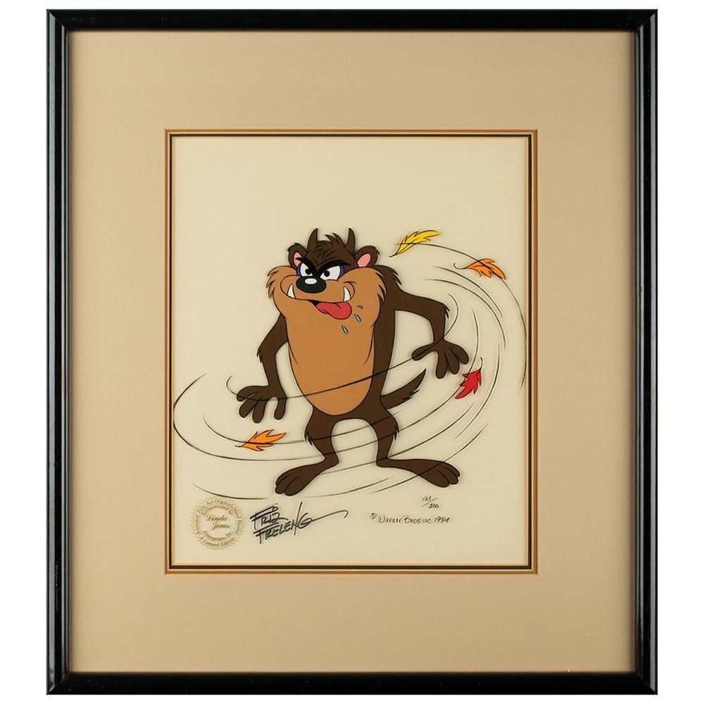 (Warner Brothers, 1984) Scarce limited edition hand-painted animation cel entitled ‘Whirling Dervish: Tasmanian Devil,' 9.75 x 12, numbered 183/200, signed in black felt tip by Friz Freleng. The scene shows Taz in a full-length pose surrounded by a cyclone of leaves. Lower left bears a golden Linda Jones Enterprises seal. Triple-matted and framed to an overall size of 17 x 19. In fine condition, with some wear to frame. Accompanied by a certificate of authenticity from Gallery Lainzberg. A desirable, long sold-out Freleng-signed edition.