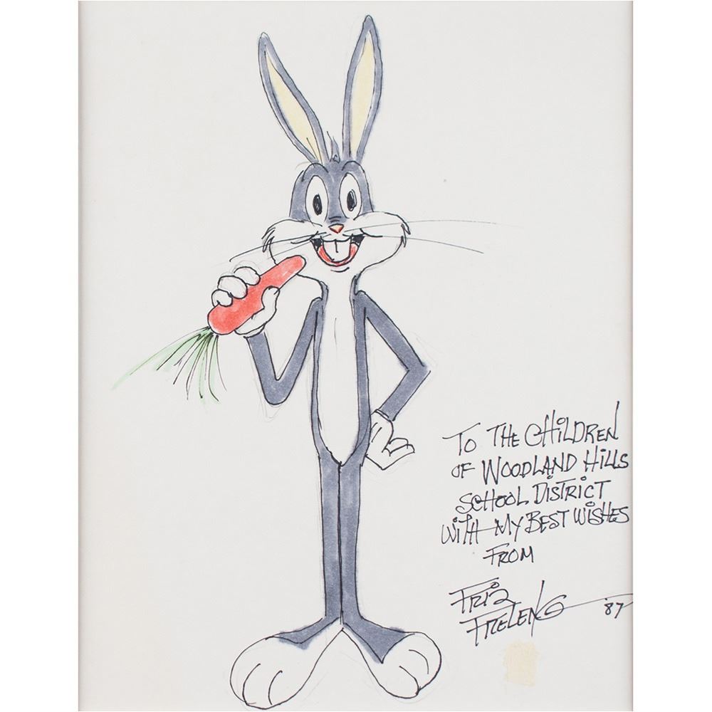Original felt tip sketch of Bugs Bunny in a full-length pose accomplished by Freleng on a white 7 x 9 sheet, signed and inscribed in black felt tip, "To the children of Woodland Hills School District, with my best wishes, from Friz Freleng." Matted to an overall size of 10 x 13. In fine condition, with a small piece of adhesive residue under the signature.