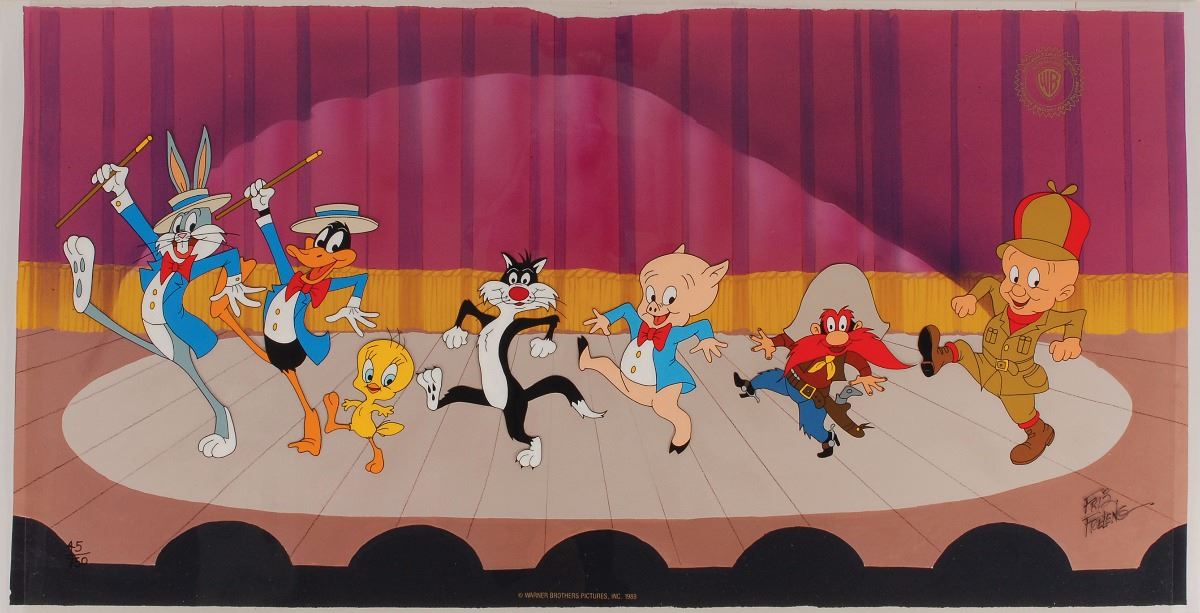 (Warner Brothers Studios, 1989) Original limited edition cel from Friz Freleng, numbered 45/750, showing Bugs Bunny, Daffy Duck, Porky Pig and other Looney Tunes characters dancing across a theater stage. Signed in the lower right in black felt tip by Freleng. The cel is placed on the original lithograph background. Character sizes range from 2 x 2.75 (Tweety) to 4.75 x 7.25 (Bugs), with overall dimensions of 26 x 13.25. The piece has the gold Warner Bros. seal in upper right, as well as 1989 copyright text along bottom edge. In fine condition.