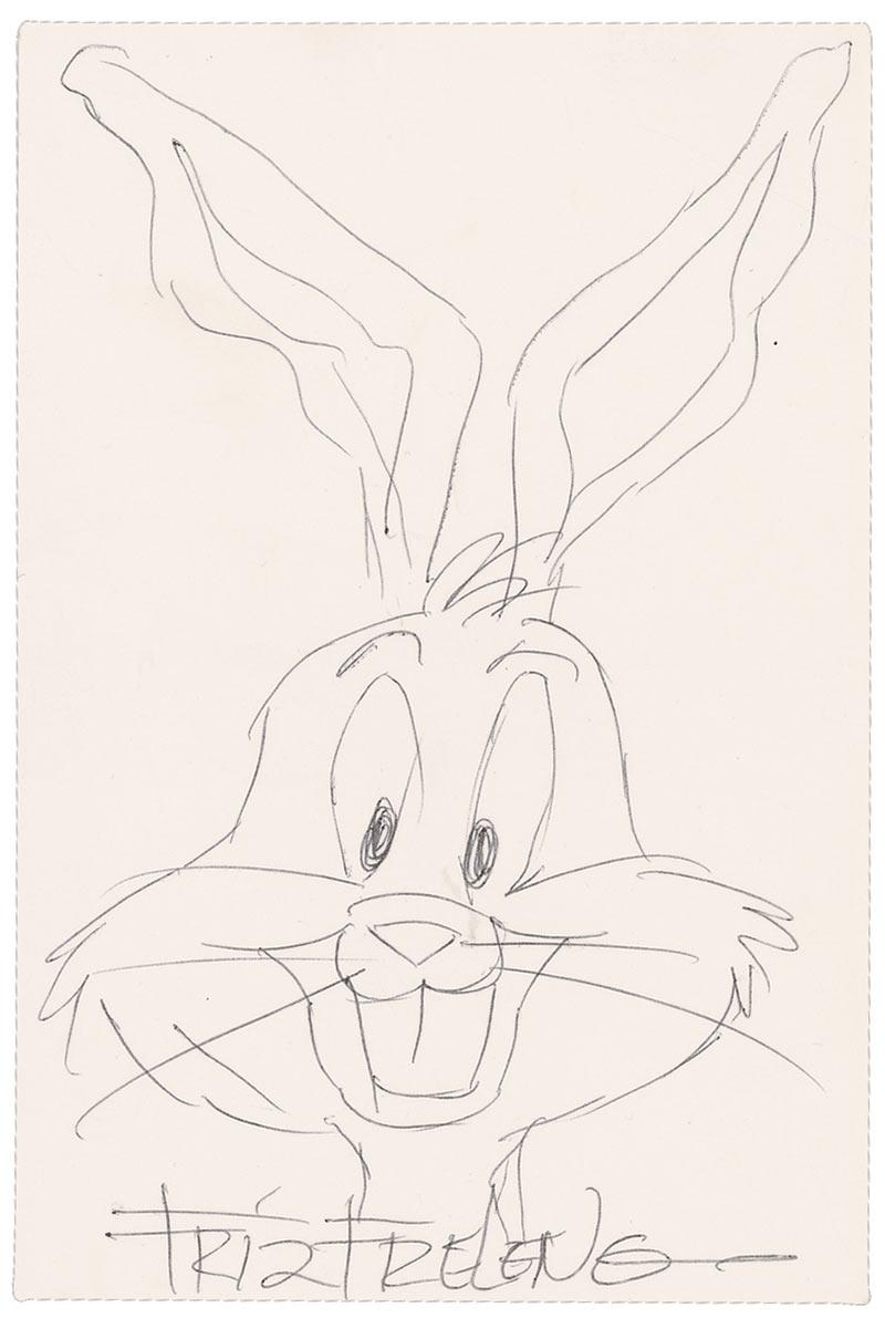Original signed ballpoint sketch of Bugs Bunny on an off-white 4 x 6 card, signed along the bottom by Freleng. In fine condition.