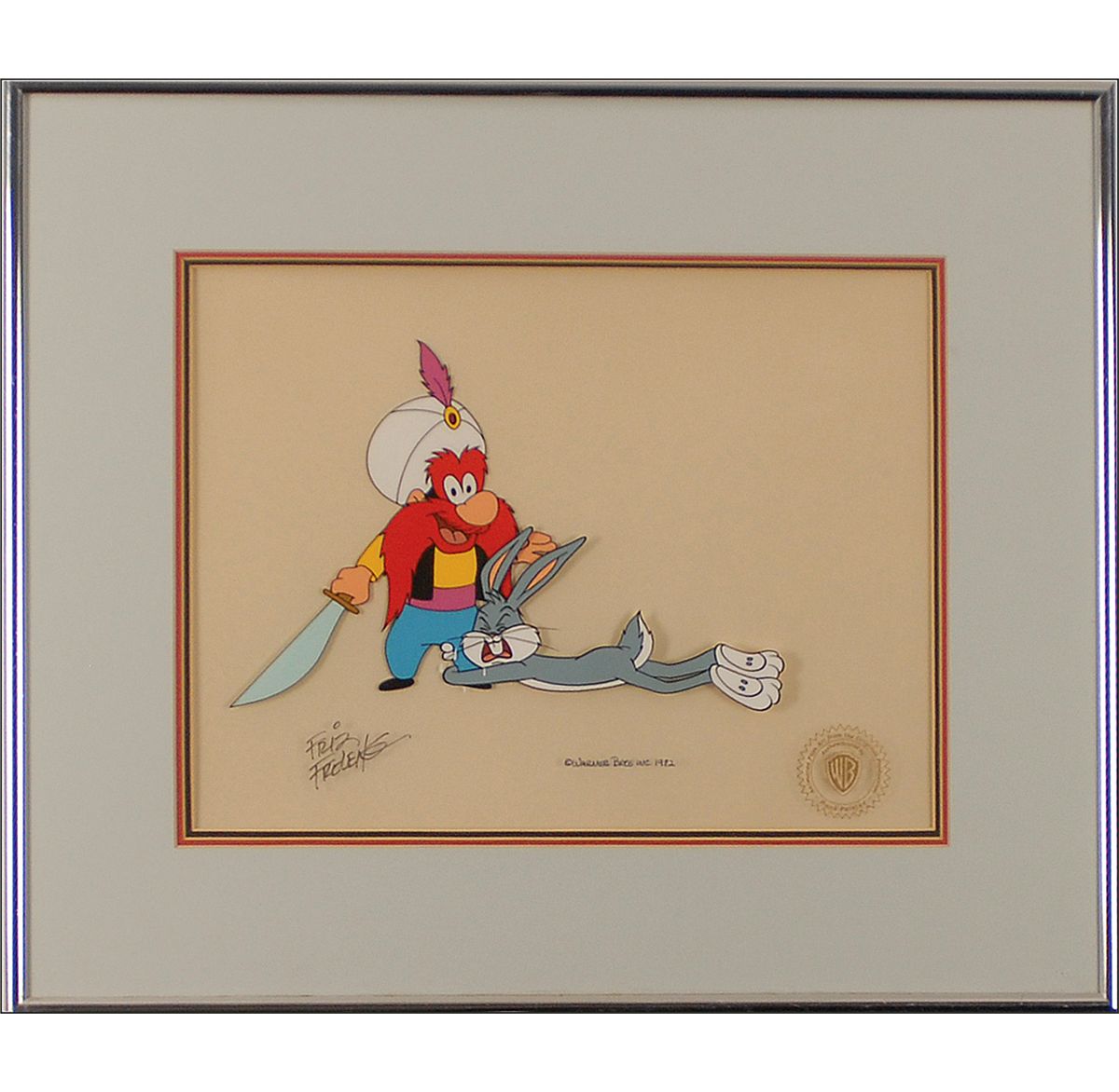 Hand-painted animation cel from ‘1001 Rabbit Tales,’ featuring Yosemite Sam and Bugs Bunny, 12 x 9, signed in black felt tip by Freleng. Triple matted and framed to an overall size of 18.25 x 15.25. In fine condition.