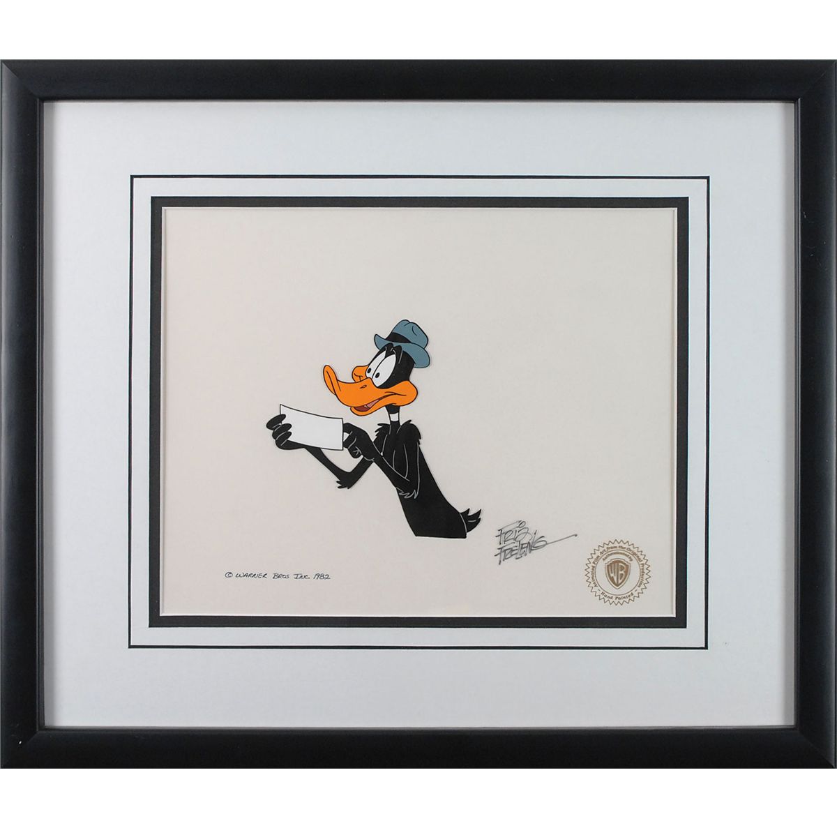 Original hand-painted production cel of Daffy Duck from ‘Bugs Bunny's 1001 Rabbit Tales,’ 12 x 9.5, signed in black felt tip by Freleng. Cel bears a gold Warner Bros. stamp to the lower right and a handwritten 1982 copyright notice. Nicely double-matted and framed to an overall size of 19.5 x 16.5. In fine condition. Accompanied by a certificate of authenticity from Warner Bros.