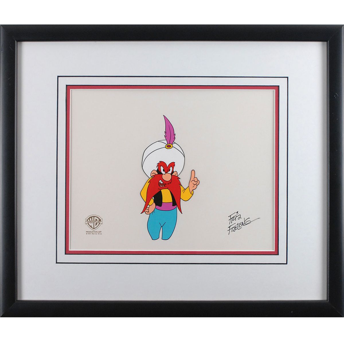 Original hand-painted production cel of Yosemite Sam from ‘Bugs Bunny's 1001 Rabbit Tales,’ 12 x 9.5, signed in black felt tip by Freleng. Cel bears a gold Warner Bros. stamp to the lower left. Nicely double-matted and framed to an overall size of 19.5 x 16.5. In fine condition. Accompanied by a certificate of authenticity from Warner Bros.
