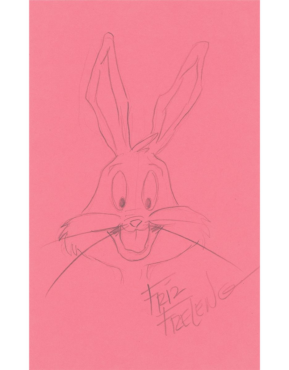 Original pencil sketch of Bugs Bunny on a pink 5 x 8 card, signed “Friz Freleng.” In very fine condition.