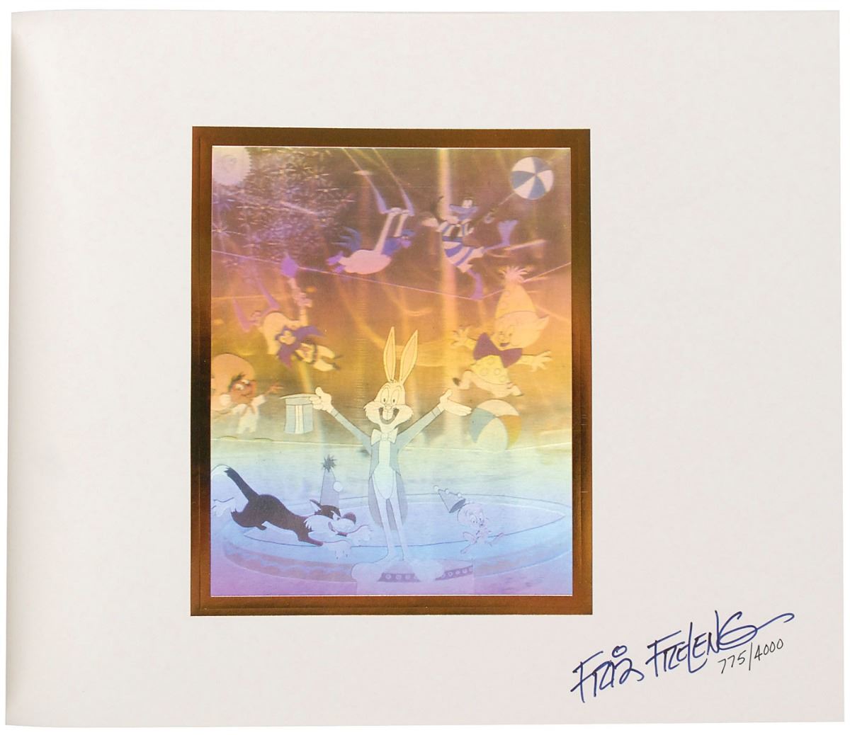 Box set entitled The Art of Friz Freleng. Includes one book examining the life and creative genius of Freleng, hardcover, 240 pages, limited edition (775/4000), signed on the hologram page in black ink by Freleng. Also includes three limited edition sericels with facsimile signatures, an animator’s workbook, an audio tape entitled Animation: The Art of Friz Freleng, Words and Music, and a video tape entitled Freleng: Frame by Frame. These items are contained within a book-like case, and both the case and signed book are housed in a leatherbound slipcase. In very fine condition.