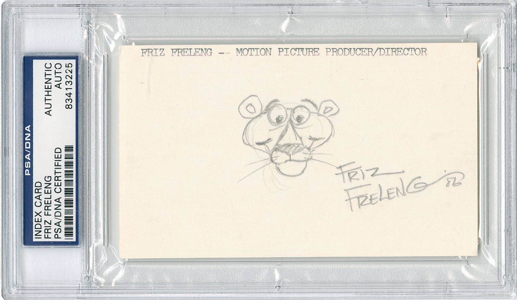 Original pencil sketch of the Pink Panther accomplished by Freleng on a white 5 x 3 card, signed below, "Friz Freleng, '86." Encapsulated in a PSA/DNA authentication holder. In fine condition.