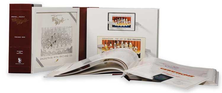 Two-volume set titled Animation: The Art of Friz Freleng, consisting of a limited edition hardcover book (1909/4000) signed by Freleng on a page bearing a Looney Tunes hologram. Second book is actually a case which includes an animator’s workbook, an audio tape entitled Animation: The Art of Friz Freleng, Words and Music, and a video tape entitled Freleng: Frame by Frame. All of the items are housed together in a leather-backed slipcase. Accompanied by two original introduction pages from Donovan Publishing Company. In very fine condition and a must for the serious collector. RRAuction COA.