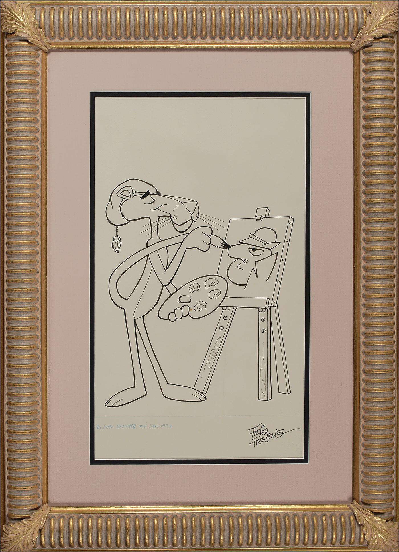 Original hand-inked Pink Panther comic art, done in a studio artist’s hand, depicting the Pink Panther using his own tail to paint a portrait of the Inspector, on a 10 x 17.5 off-white sheet, marked at the bottom in blue pencil, “The Pink Panther # 5, Jan. 1972,” signed at the bottom in black felt tip by Freleng. Double matted and framed to an overall size of 19.5 x 26.5. In fine condition, with a light vertical crease to right of center passing through a portion of sketch. Oversized.