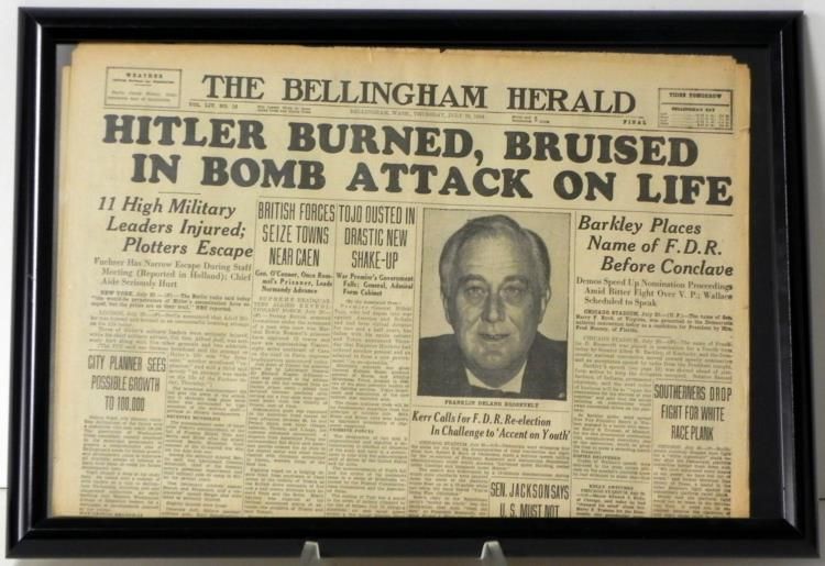 Offered here is this Framed Original Newspaper Headlined "Hitler Burned, Bruised in Bomb Attack on Life". It is from The Bellingham Herald and is dated Thursday, July 20, 1944. It measures 20" x 14".