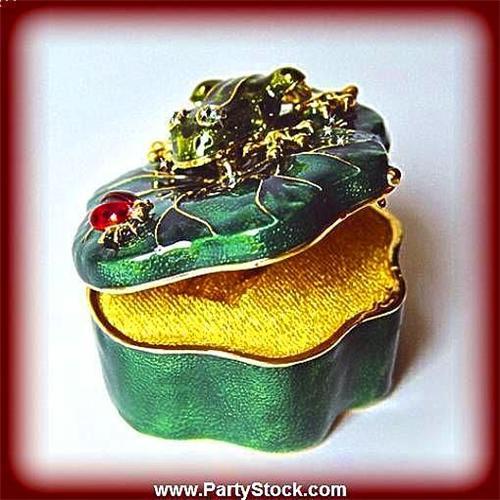 Frog Ladybug Ring Box is set with genuine, sparkling Swarovski crystals and detailed in 24K gold! Perfect for jewelry, trinkets or other keepsakes. Please see dimensions and more information below. Arrives in padded Presentation Box, with a Certificate of Authenticity.<BR><BR>Each of these items is meticulously crafted from fine pewter. Then, most are embellished or coated in solid 24 Karat Gold. Finally, the piece is hand enameled and lavishly inlaid with genuine Swarovski crystals by skilled artisans. Many of our collectibles are lined in velvet or fitted with ring inserts to make a most splendid jewelry presentation. A ll pieces are finished on the inside with a sparkling, swirled enamel. Our collection adds the definitive touch to any gift-giving occasion.A lso, this collection is issued in limited editions and will become a valuable keepsake to those who possess them, for years to come.<BR><BR>Shipping Charges within the USA: $6 for the first item & $3 for each additional item; Within Canada: $15.00 for the first item and $3 for each additional item; Within Europe or Australia: $38 for the first item & $6 for each additional item.<BR><BR>Height: 1.75 Inch <BR>Width: 2.5 Inch