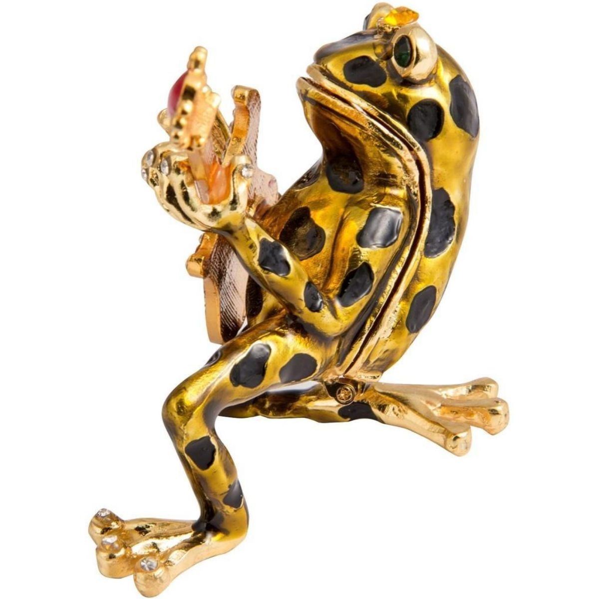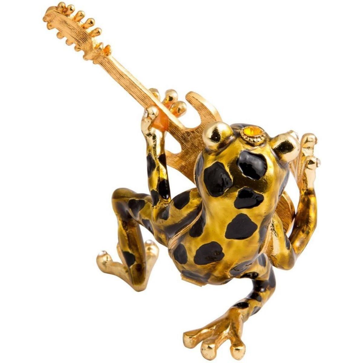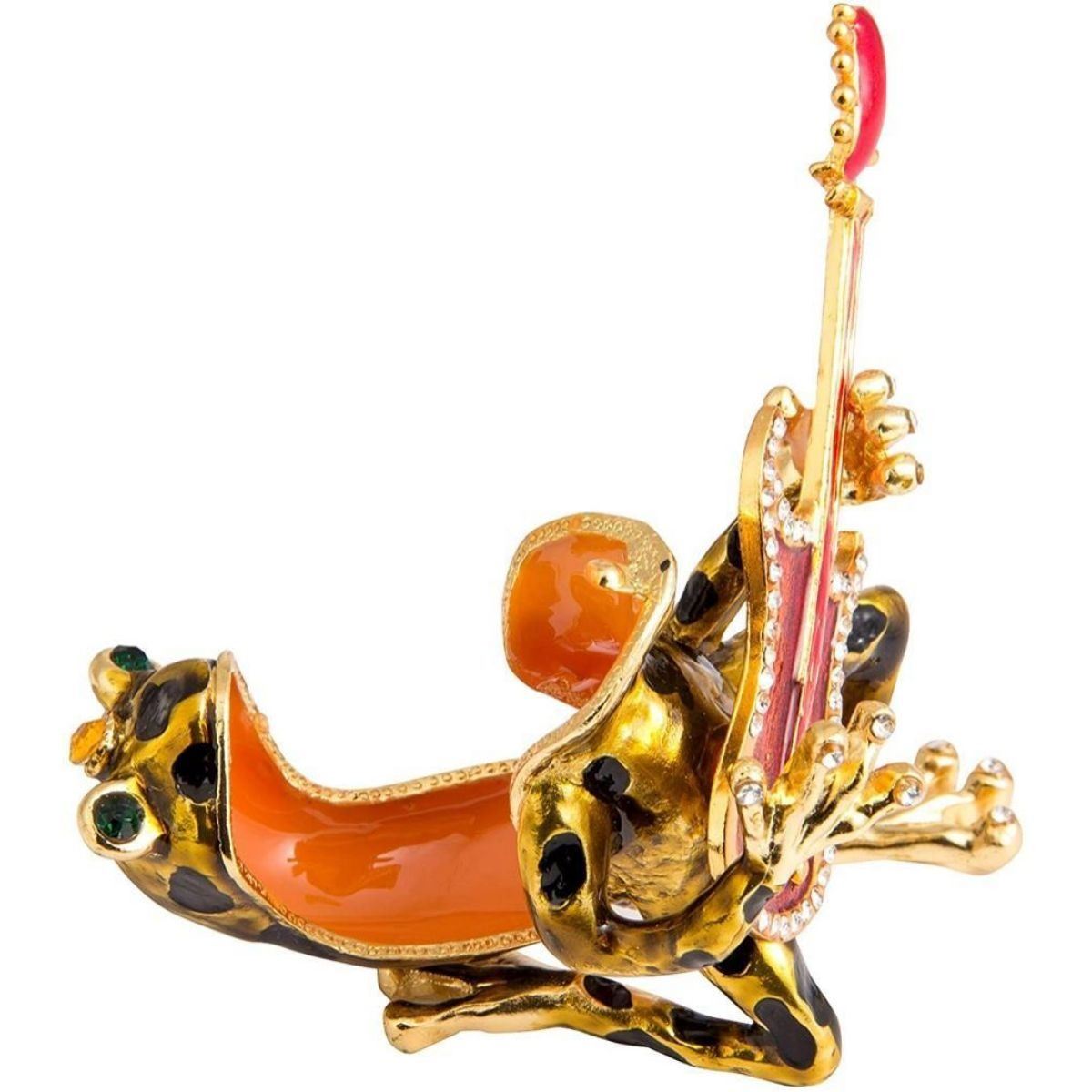 Frog Playing Guitar trinket jewel box. Enamel & gilt over pewter with embedded Austrian crystals. The top of the frog lifts up, on a hinge, with snap closure, to reveal an enameled interior for storing trinkets or jewels.  3" H X 2 1/2" W X 2 3/4" L. Comes with gift box.