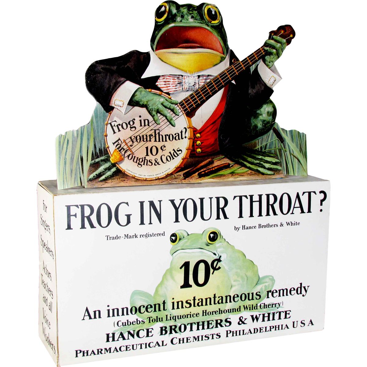 Hance Brothers & White Die Cut Cardboard Advertising Display "Frog in Your Throat". Copyright 1897. Excellent color and graphics. Slight edge wear and dog eared corner otherwise excellent condition. 21 X 26 X 6 1/4 inches.