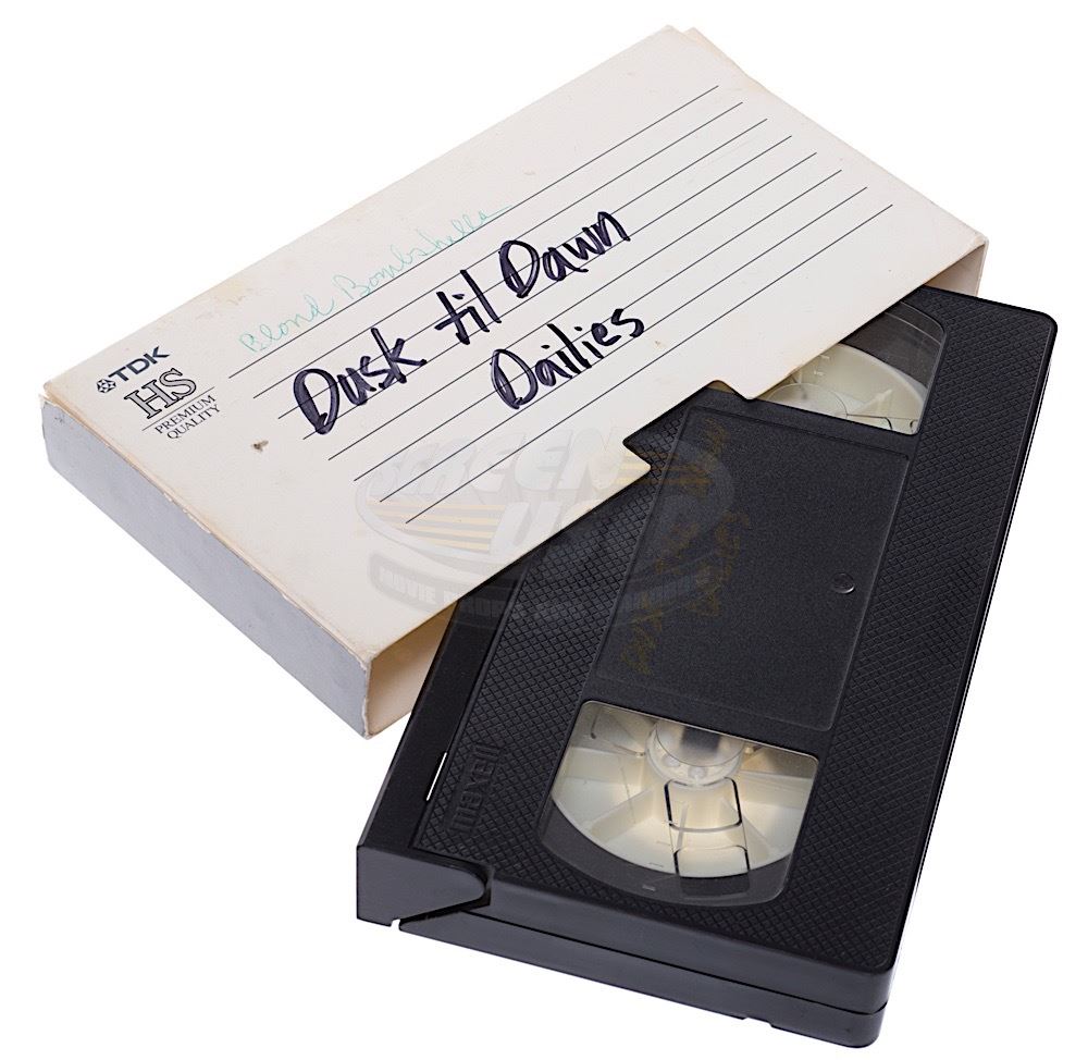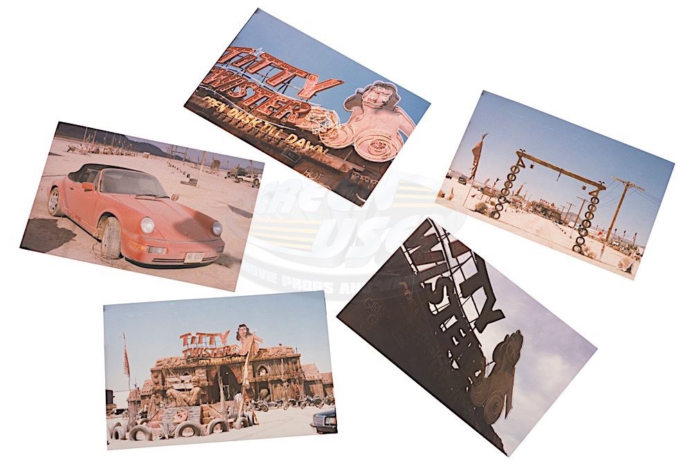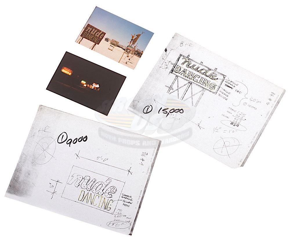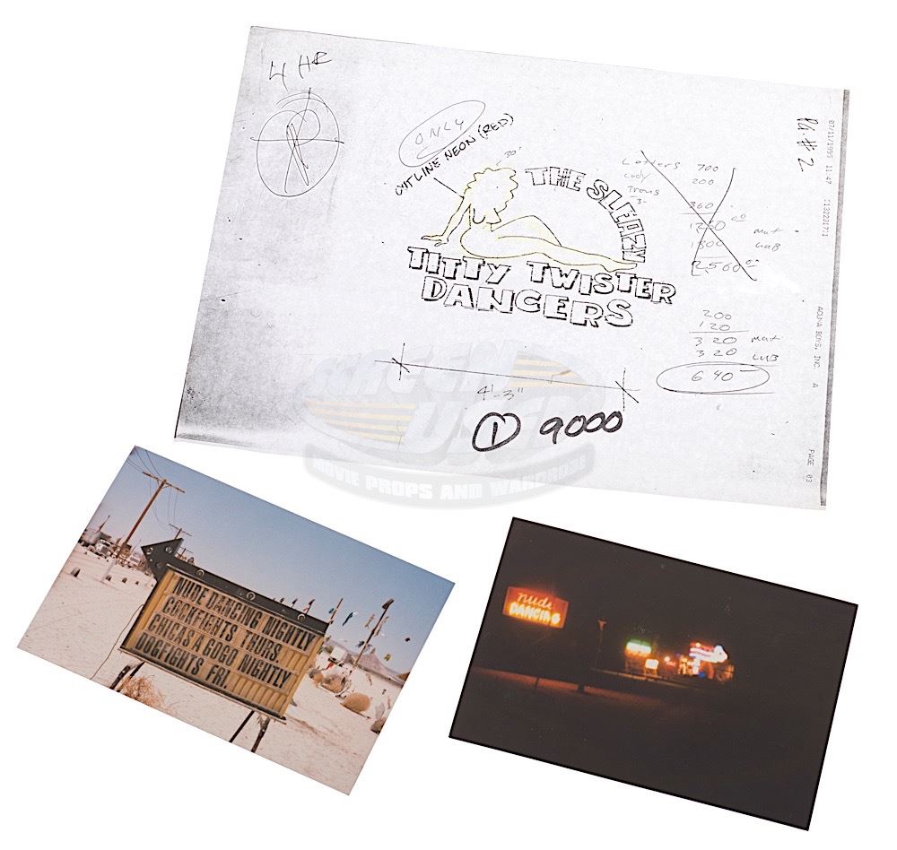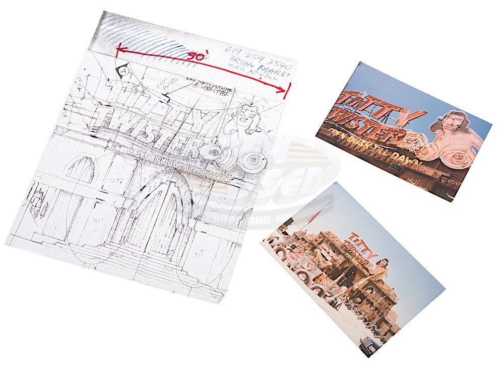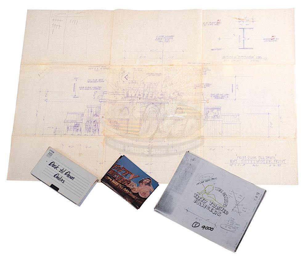 (Dimension Films, 1996) This collection production used materials consists of a blueprint of the "Titty Twister" exterior that features a few handwritten measurements and measures 36" x 24", five 8" x 10" prints of various signage designs for the bar, a VHS tape marked "Dusk Til Dawn dailies" and 20 4" x 6" photographs taken on set during filming that feature the various details of the bar set and props.