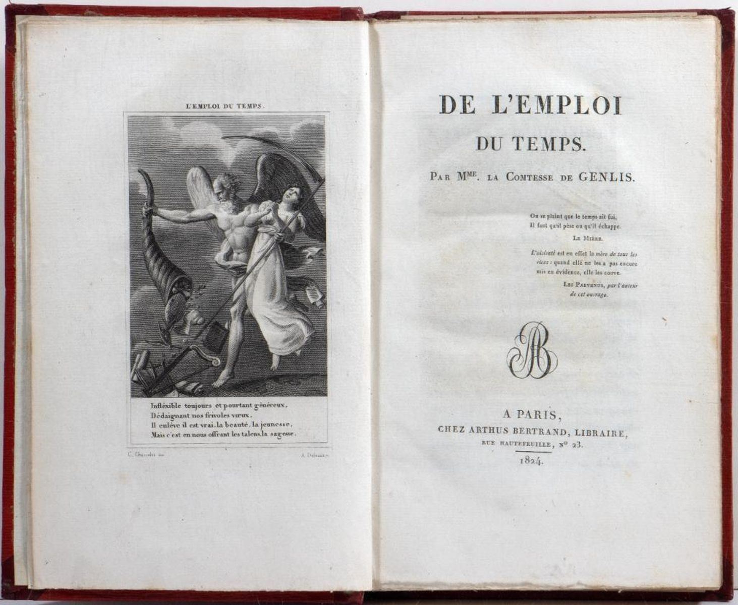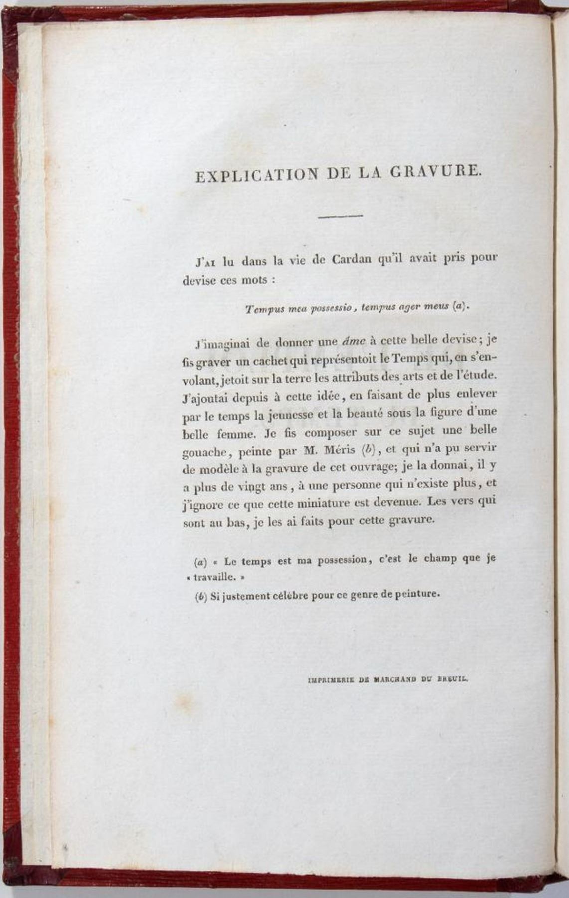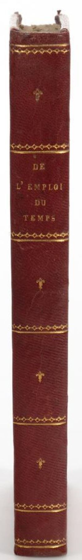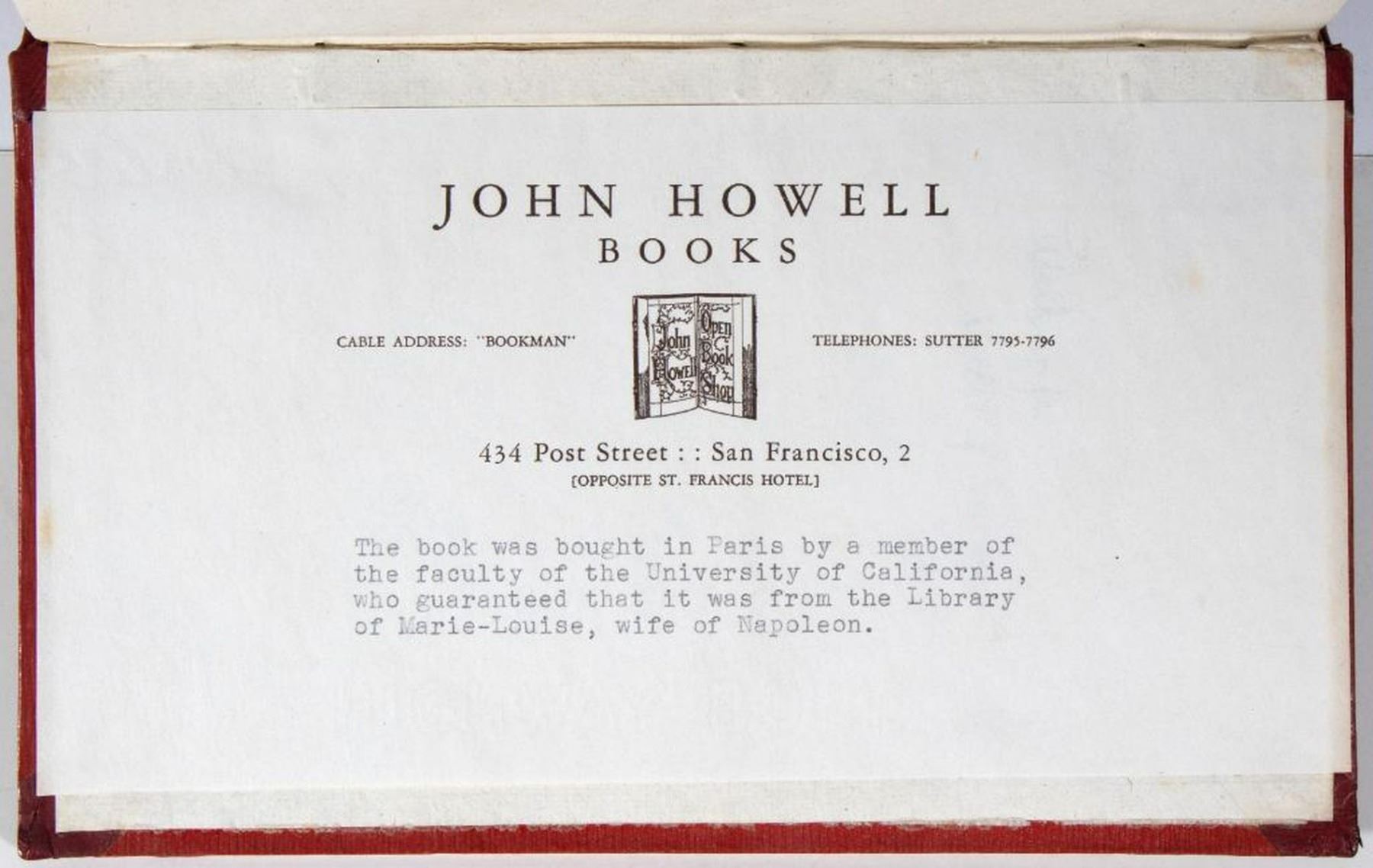 [MARIE LOUISE, DUCHESS OF PARMA/NAPOLEON.] De L'Emploi du Temps. Par Mme. La Comtesse de Genlis. Paris: Chez Arthus Bertrand, Libraire, 1824. 8vo. Original red leather boards with gilt-embossed spine and Marie Louise's gilt cypher, a crown over "ML," on the front and back covers. Engraved frontispiece. A volume in French, owned personally by Marie Louise, second wife of Napoleon. An undated letter is tipped into the back, on the letterhead of John Howell Bookseller (San Francisco), stating that: "The book was bought in Paris by a member of the faculty of the University of California, who guaranteed that it was from the library of Marie-Louise, wife of Napoleon." Very Good. Light wear and faint stains to the covers, which remain bright. Occasional foxing and discoloring, but overall clean.