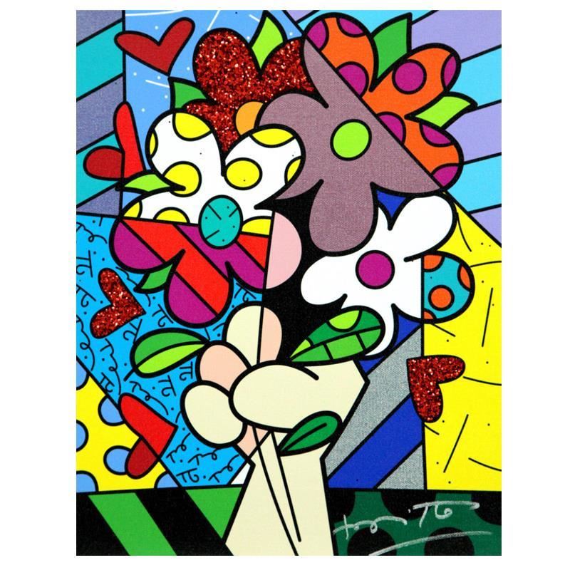 "From Me" is a limited edition giclee on canvas with diamond dust embellishment by Romero Britto. The piece is numbered, hand signed by the artist, and Authenticated. Measures approximately: 14" x 11". This item requires special handling and may have a longer than usual turnaround.