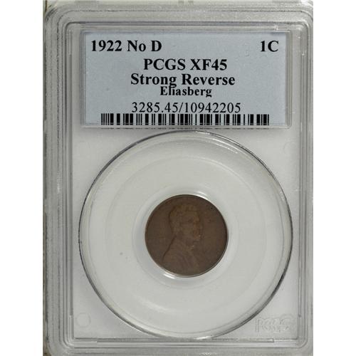 <B>1922 1C No D Strong Reverse XF45 PCGS.</B></I> FS-013.2. Die Pair 2. An attractive chocolate-brown representative of the most popular of the three filled-mintmark varieties for this year. As always, the detail is somewhat lacking on the obverse, but the reverse is bold. Faint fingerprints are noted in the obverse fields.<BR><I>From The Collection of Louis E. Eliasberg, Sr.</B></I><BR><BR><b>Shipping:</b> Coin/Currency (<a target="_blank" href="http://www.heritageauctions.com/common/shipping.php">view shipping information</a>)