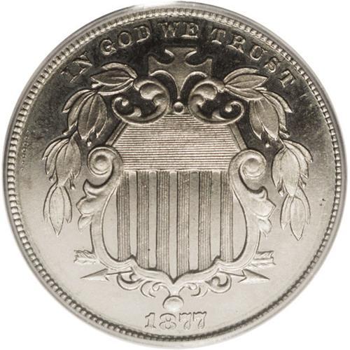 <B>1877 5C PR64 Cameo NGC.</B></I> An attractively toned example of this popular and low-mintage proof-only issue. The lightly green-toned devices contrast nicely with the modestly reflective ice-blue mirrors. The obverse is clean for the grade, though a sizable vertical contact mark extends from an upper-left star.<BR><I>From The Dale A. Konigsburg Collection.</B></I><BR><BR><b>Shipping:</b> Coin/Currency (<a target="_blank" href="http://www.heritageauctions.com/common/shipping.php">view shipping information</a>)