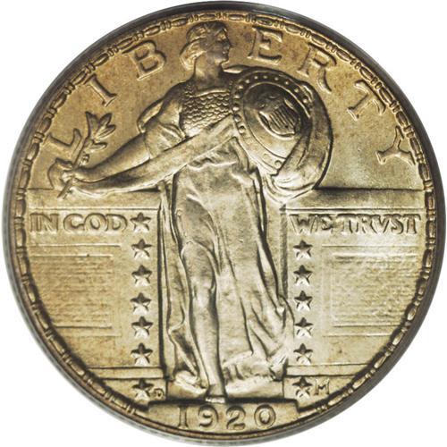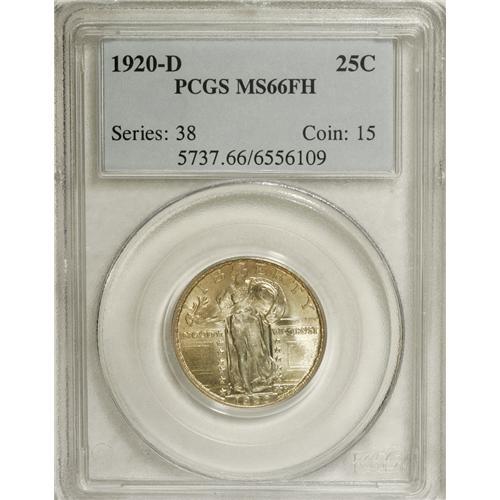 <B>1920-D 25C MS66 Full Head PCGS.</B></I> Although the mintage of 3.5 million coins suggests that this is a common date, it is difficult to locate in high grades, especially with a sharp strike. This example is sharply detailed with only slight weakness evident on a few of the rivets near the shield border. Both sides exhibit light gold toning over frosty luster. Population: 8 in 66 Full Head, 4 finer (3/07).<BR><I>From The Encinitas Collection.</B></I><BR><BR><b>Shipping:</b> Coins & Currency (<a target="_blank" href="http://www.heritageauctions.com/common/shipping.php">view shipping information</a>) <BR><BR><B>Important notice:</