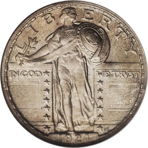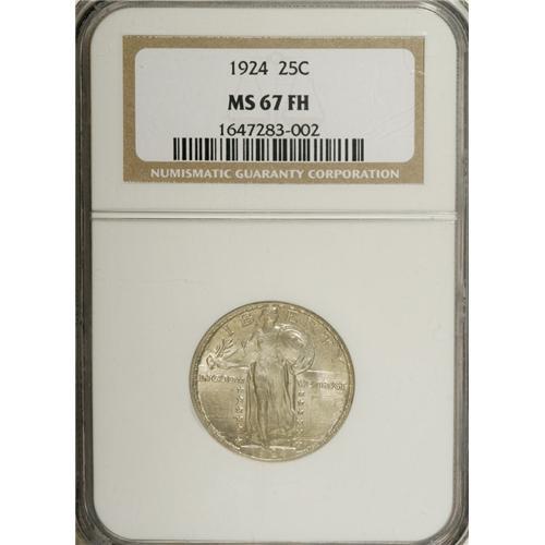 <B>1924 25C MS67 Full Head NGC.</B></I> The 1924 is one of the better produced Type Two issues, a design type whose usability in commerce was limited by the raised digits in the date. This is a splendid, fully struck example that has matte-like surfaces that are overlaid by lovely mint frost. Nearly brilliant, there is just the slightest gray patina present. An almost flawless coin and perfect for a high grade type set.<BR><I>From The Encinitas Collection.</B></I><BR><BR><b>Shipping:</b> Coins & Currency (<a target="_blank" href="http://www.heritageauctions.com/common/shipping.php">view shipping information</a>) <BR><BR><B>Important notice:</